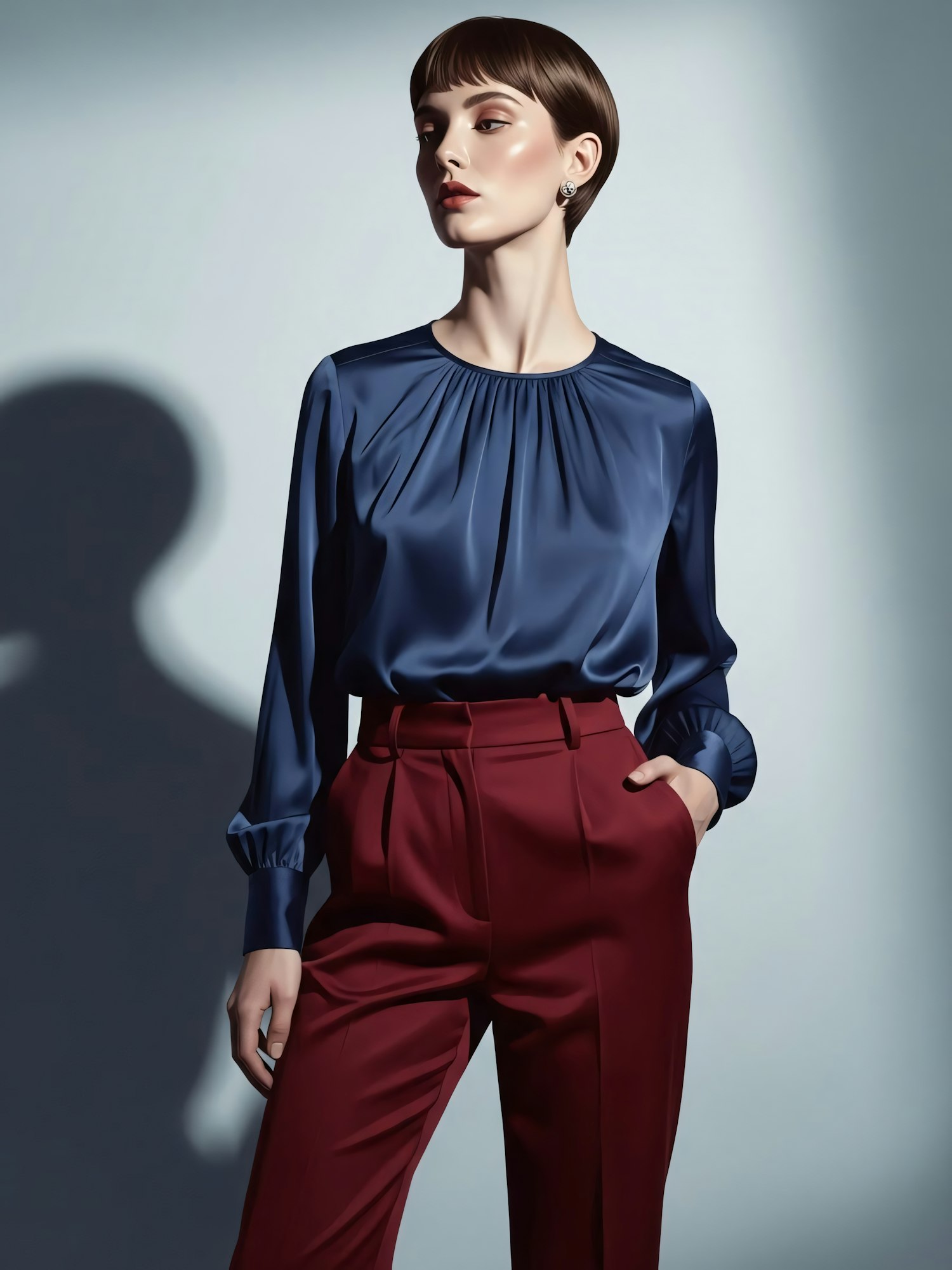 A person in a blue blouse and maroon trousers poses confidently, showcasing a chic and modern outfit with elegant lighting.