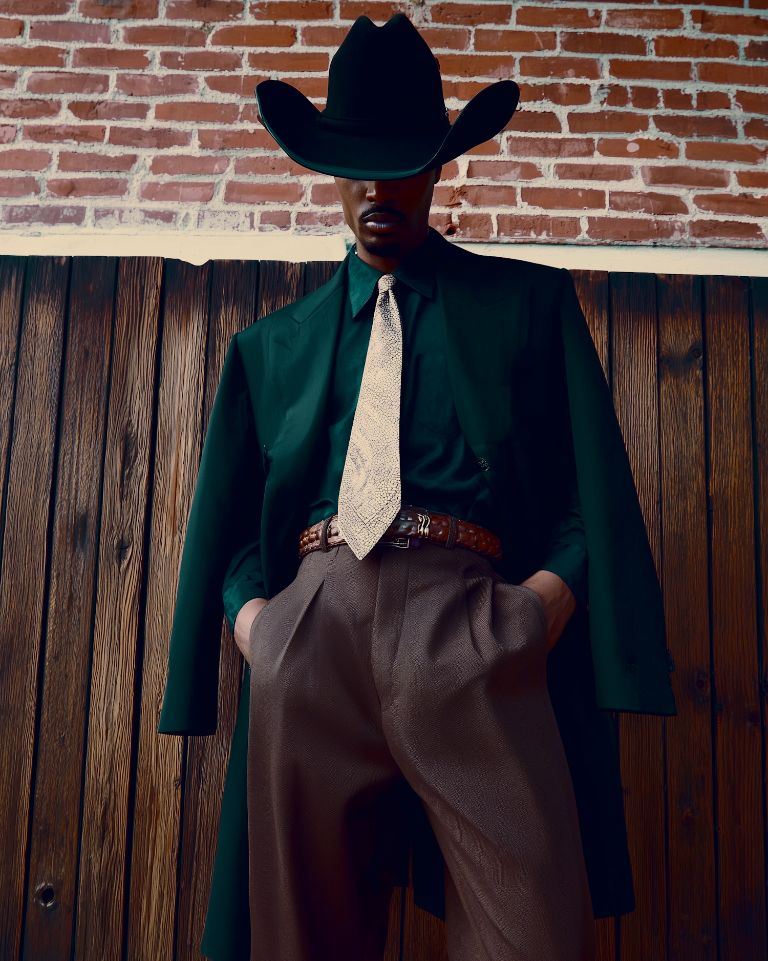 A fashionable individual in a green coat and black hat poses against a rustic wooden and brick wall, showcasing a blend of modern and classic style.