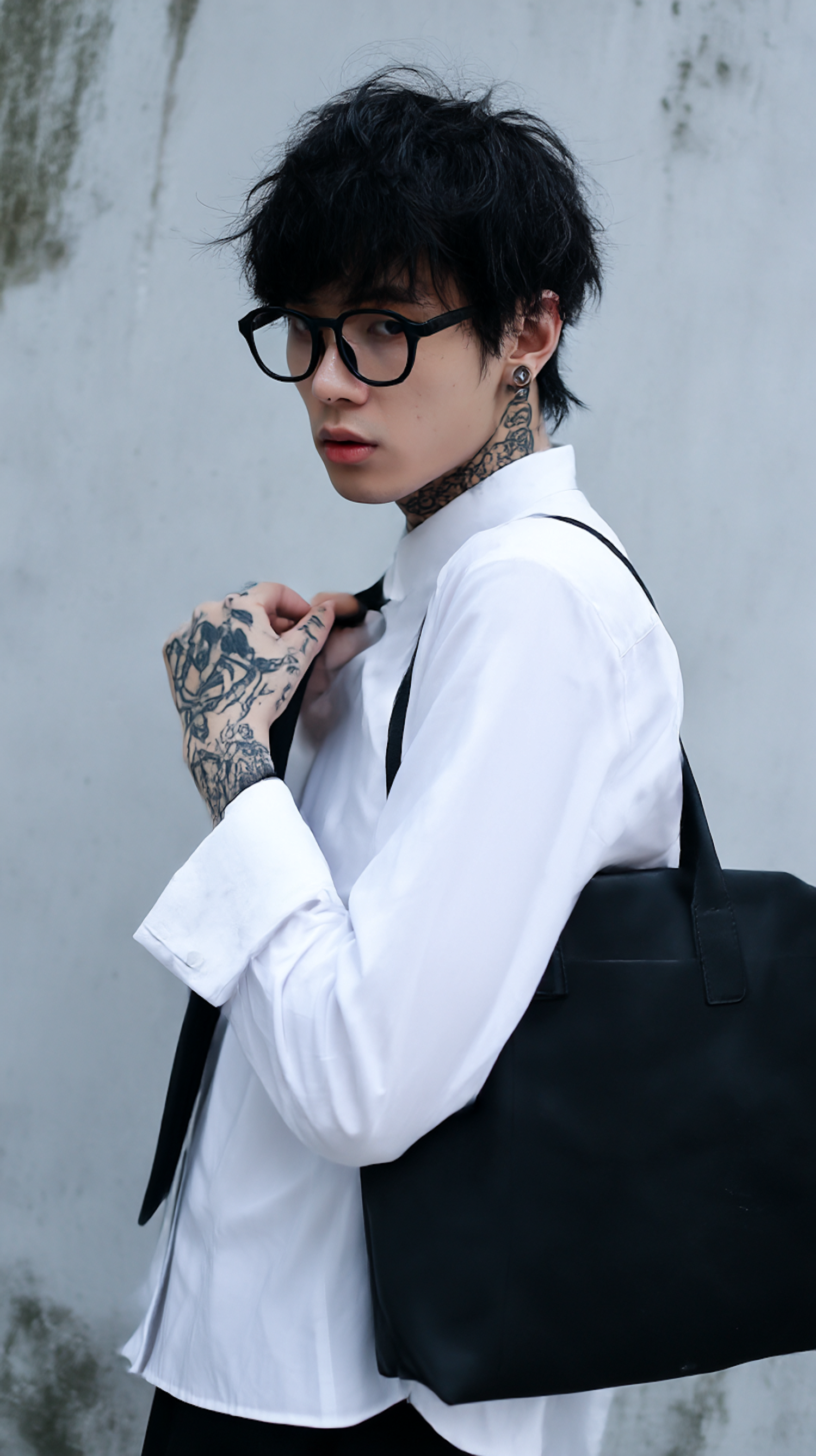 A fashionable person wearing a white shirt and glasses poses with a bag on a neutral background, displaying tattoos and a modern style.