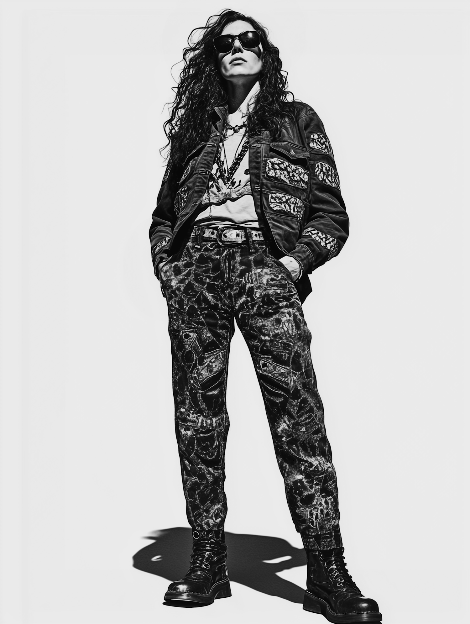 Edgy black-and-white fashion shot featuring a patterned jacket, abstract pants, combat boots, and bold accessories.