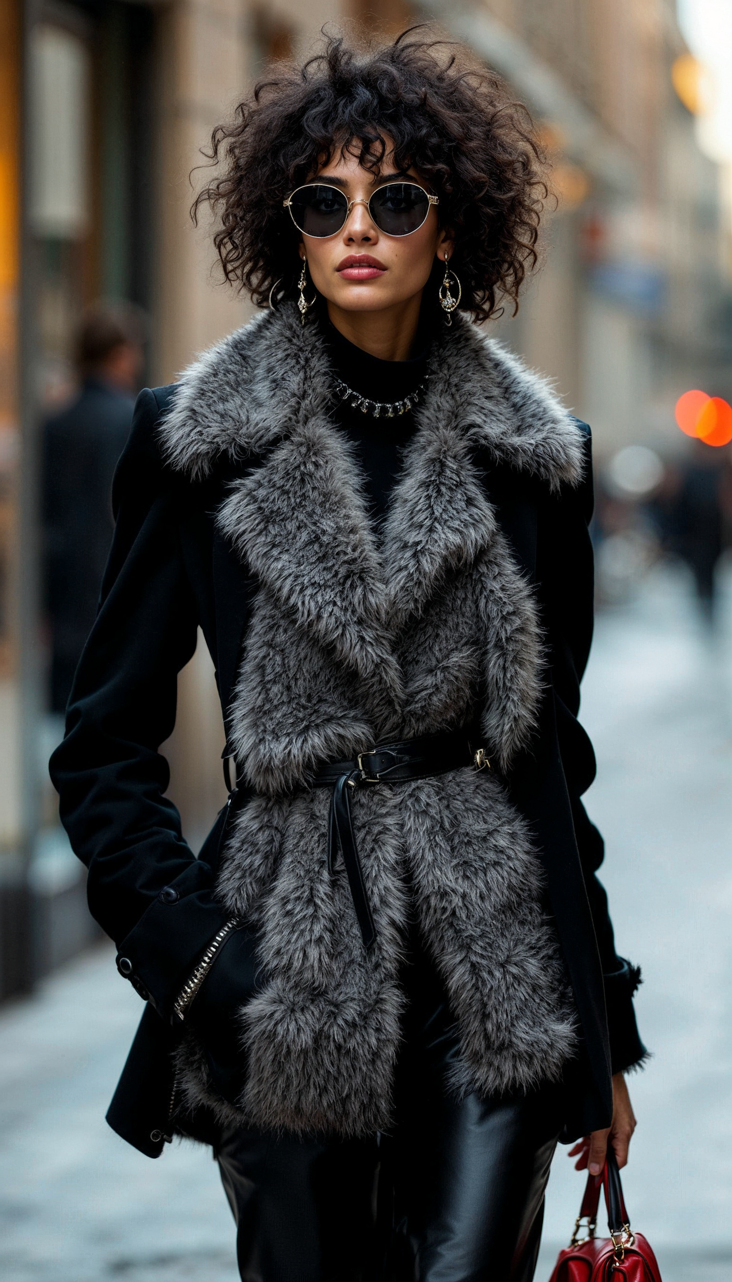 Fashionable woman in fur-trimmed coat and sunglasses, holding a red handbag on a city street.