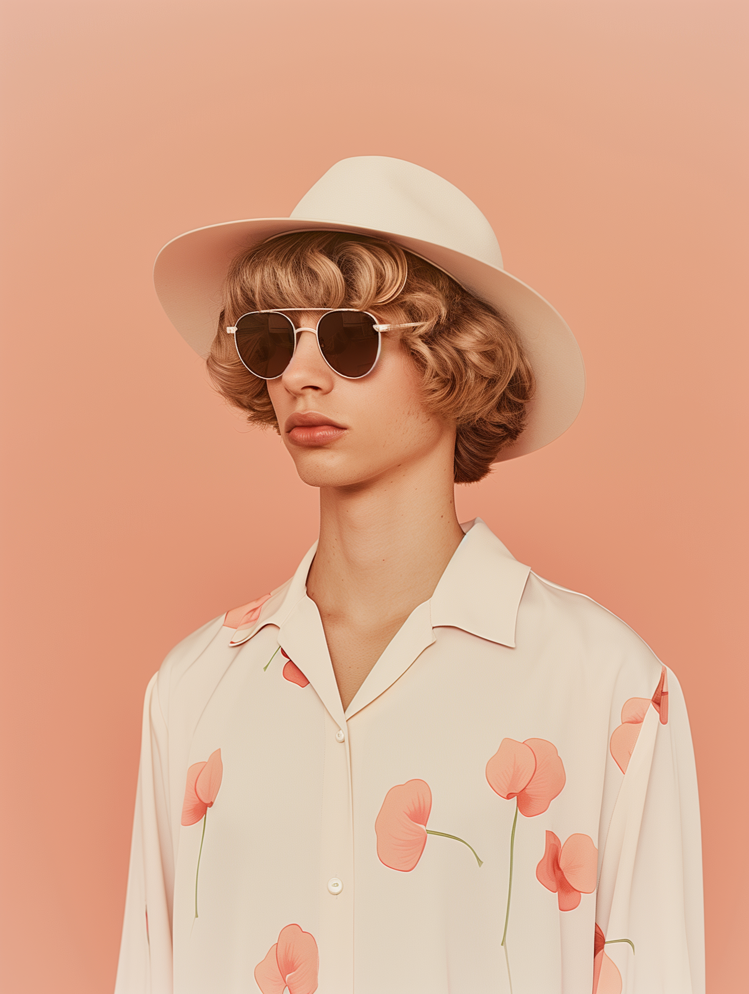 Stylish young man in a white hat and floral shirt against a peach background, exuding a modern and elegant vibe.
