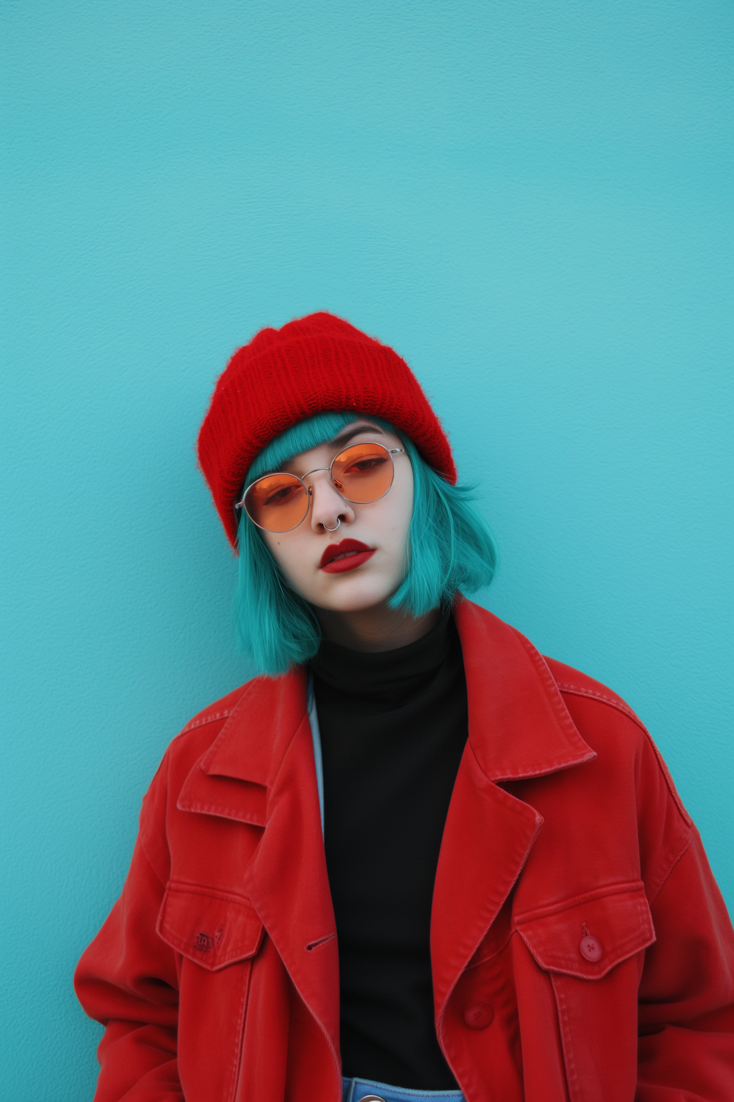 Stylish woman with teal hair and red outfit against a turquoise background, wearing orange sunglasses and a septum piercing.