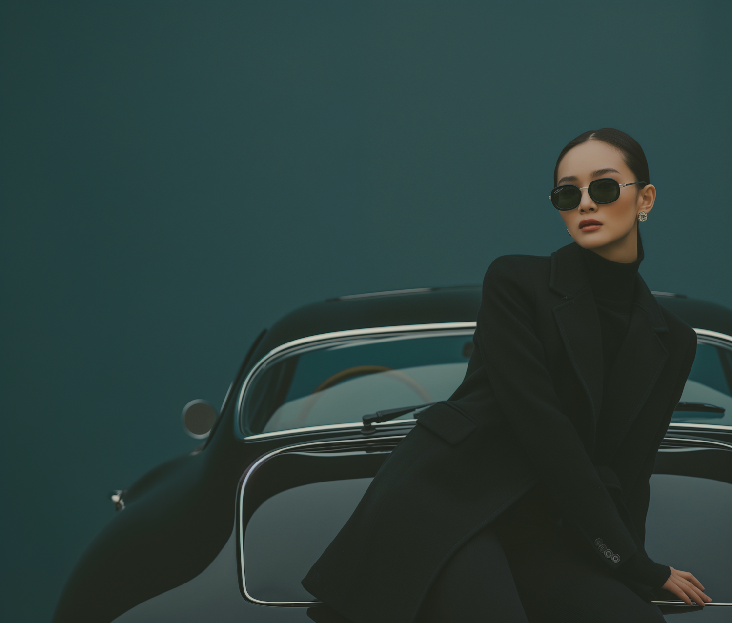 Stylish woman in black coat and sunglasses leans on a vintage car against a teal background, exuding elegance and sophistication.