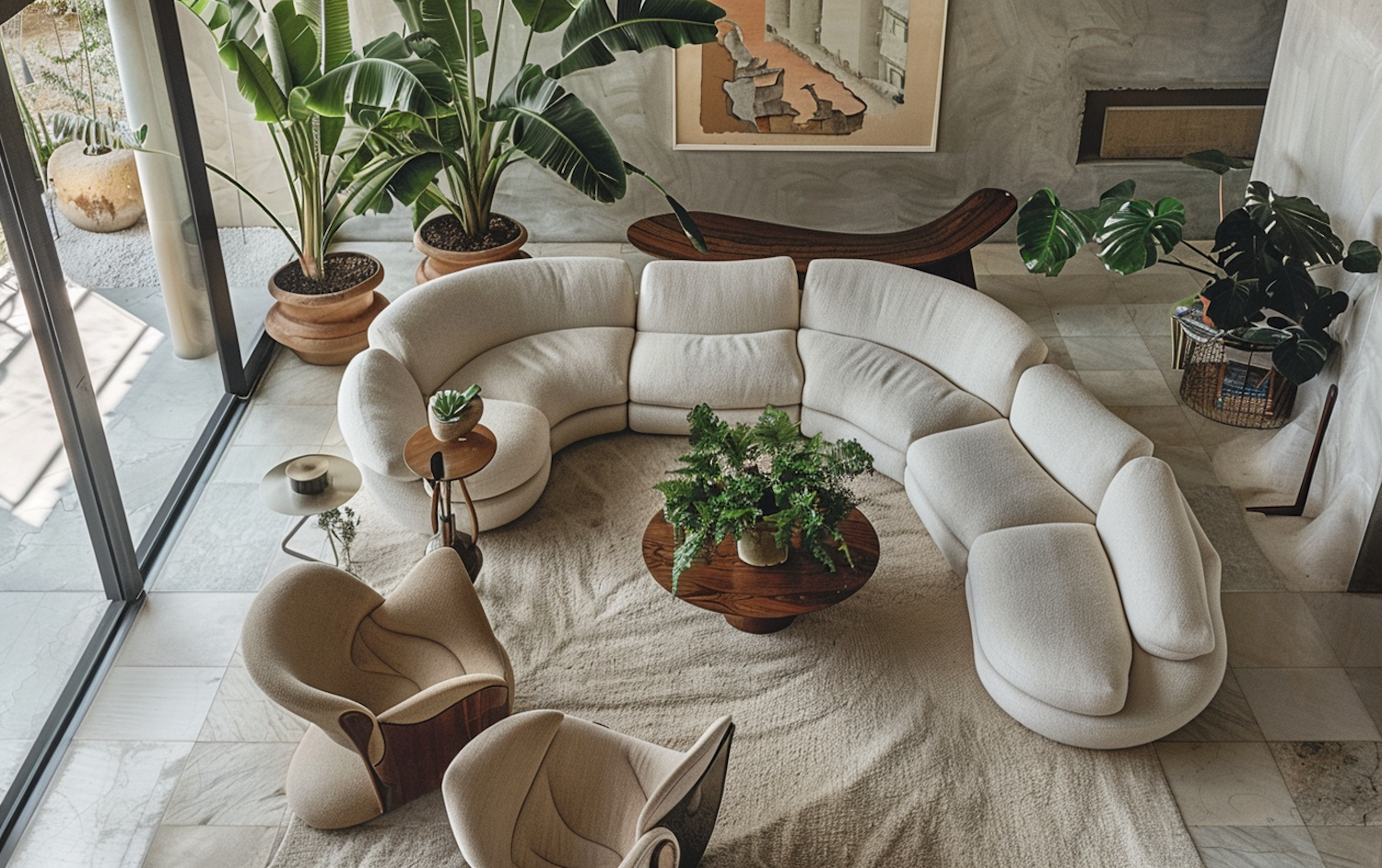 Modern living room with a curved white sofa, lush plants, and stylish armchairs. Natural light and earthy tones create a serene atmosphere.