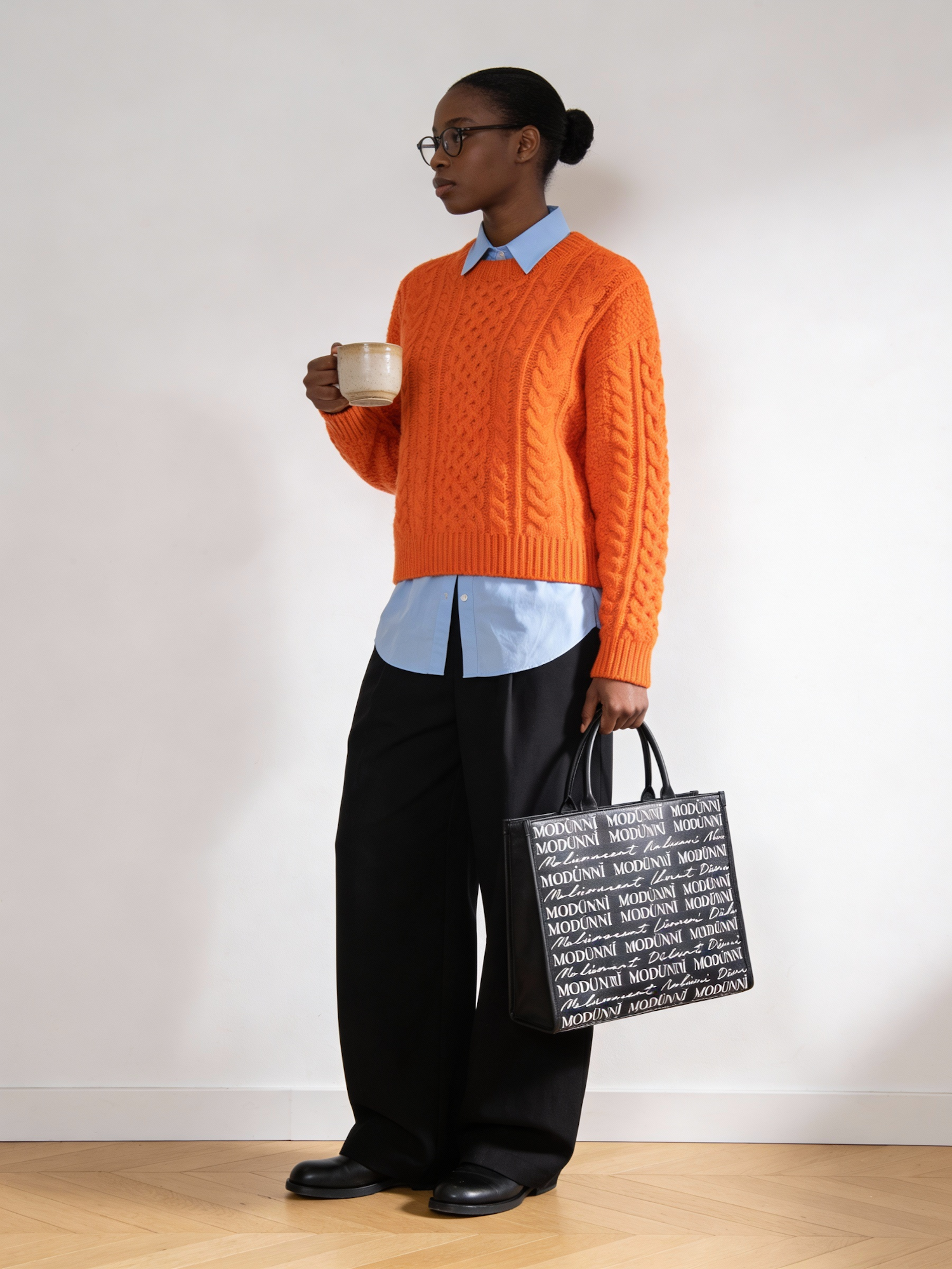 Stylish individual in an orange sweater and black trousers holding a mug and a branded tote bag, standing against a white wall.