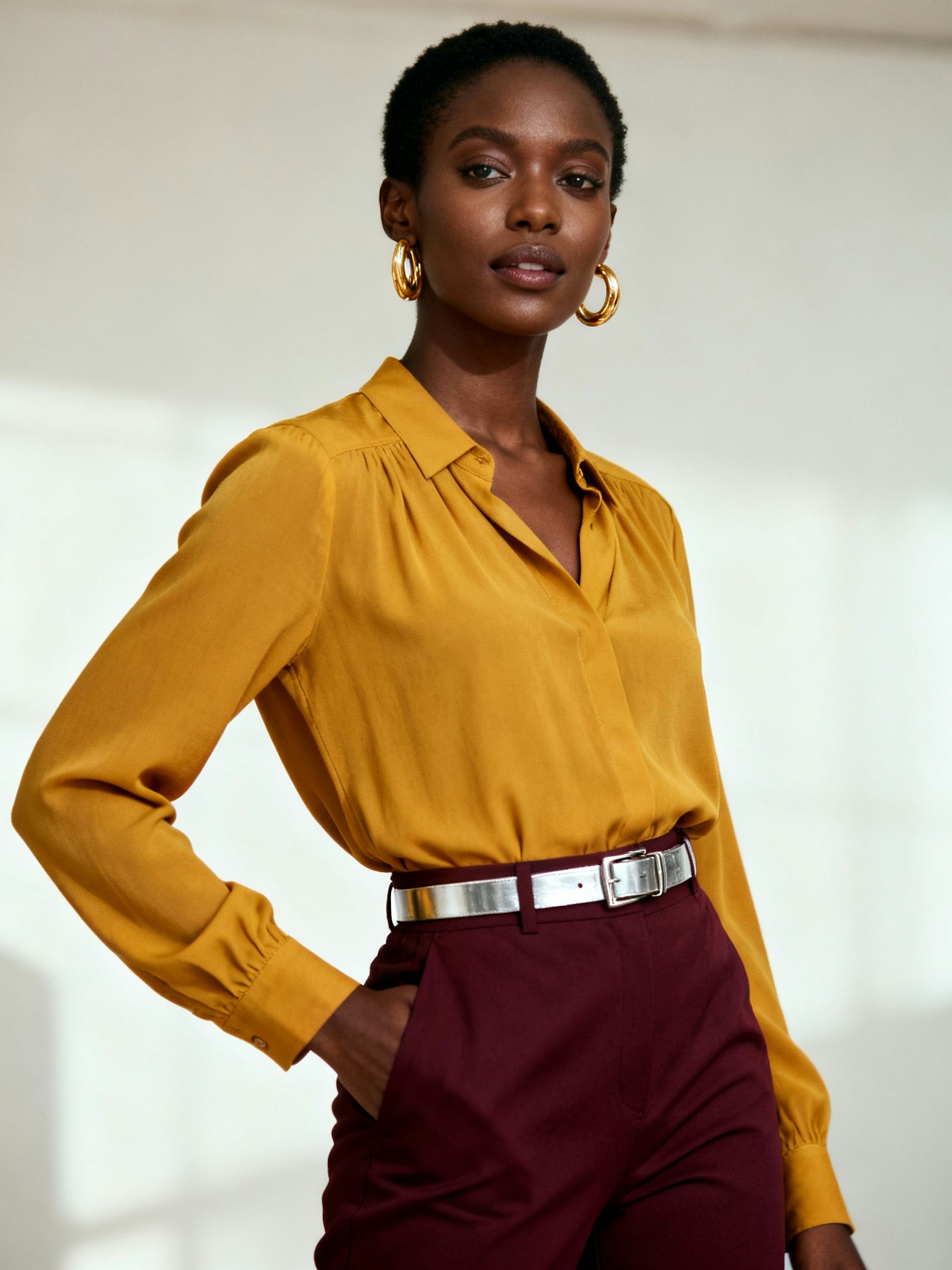High-definition, cinematic portrait of a stylish Black woman wearing a mustard yellow blouse and deep burgundy pants, accessorized with a silver belt and gold earrings. She poses confidently with a slight twist, creating dynamic lines and energy. Soft, directional lighting enhances the richness of the fabrics, metallic accents, and her glowing skin. The light, minimalist background emphasizes her vibrant ensemble and commanding presence. Fashion-forward, editorial, and visually striking—perfect for a high-impact modern style portrait.