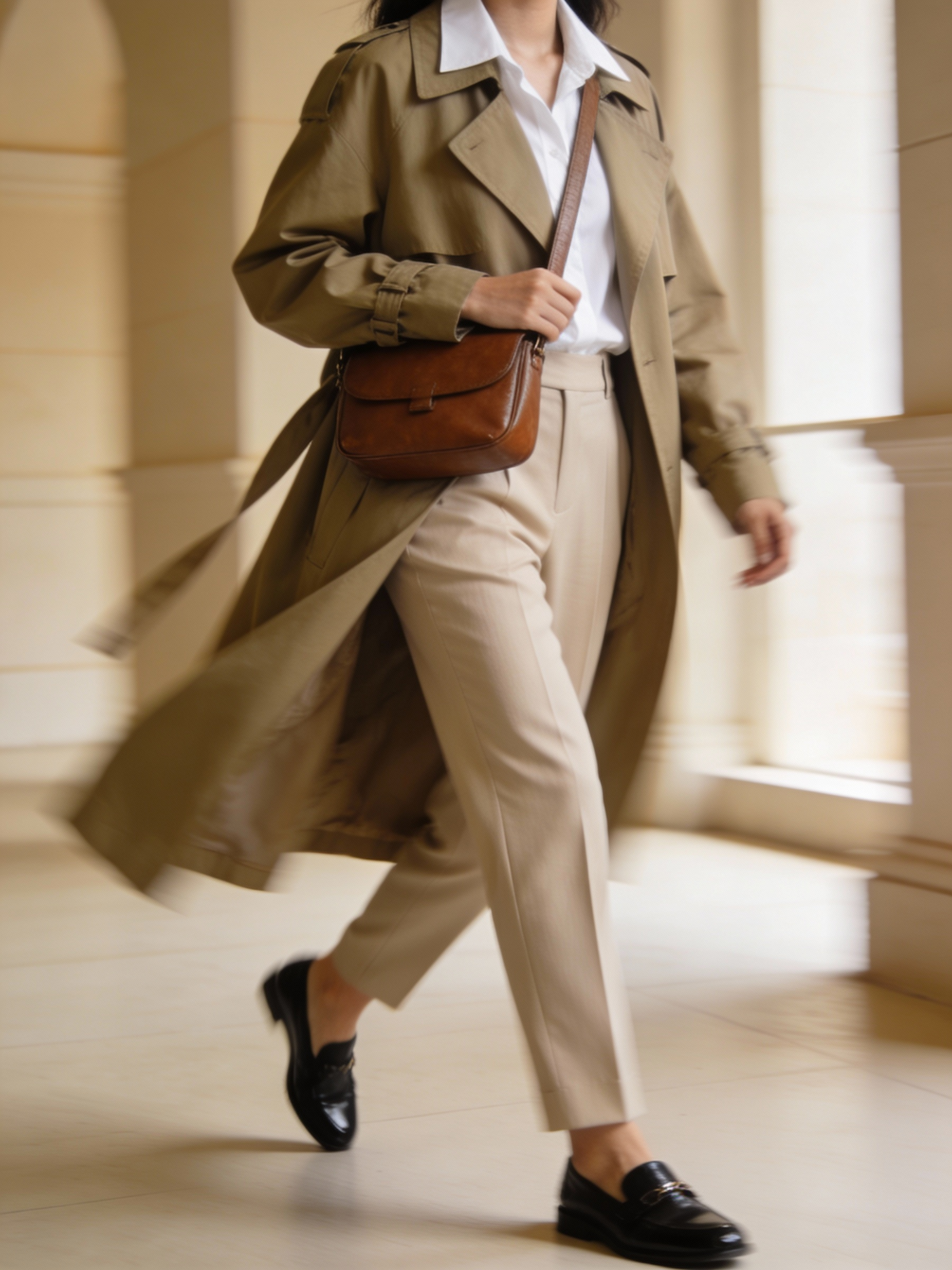 A stylish individual in a beige trench coat and tailored trousers walks confidently, carrying a brown leather bag in an elegant setting.