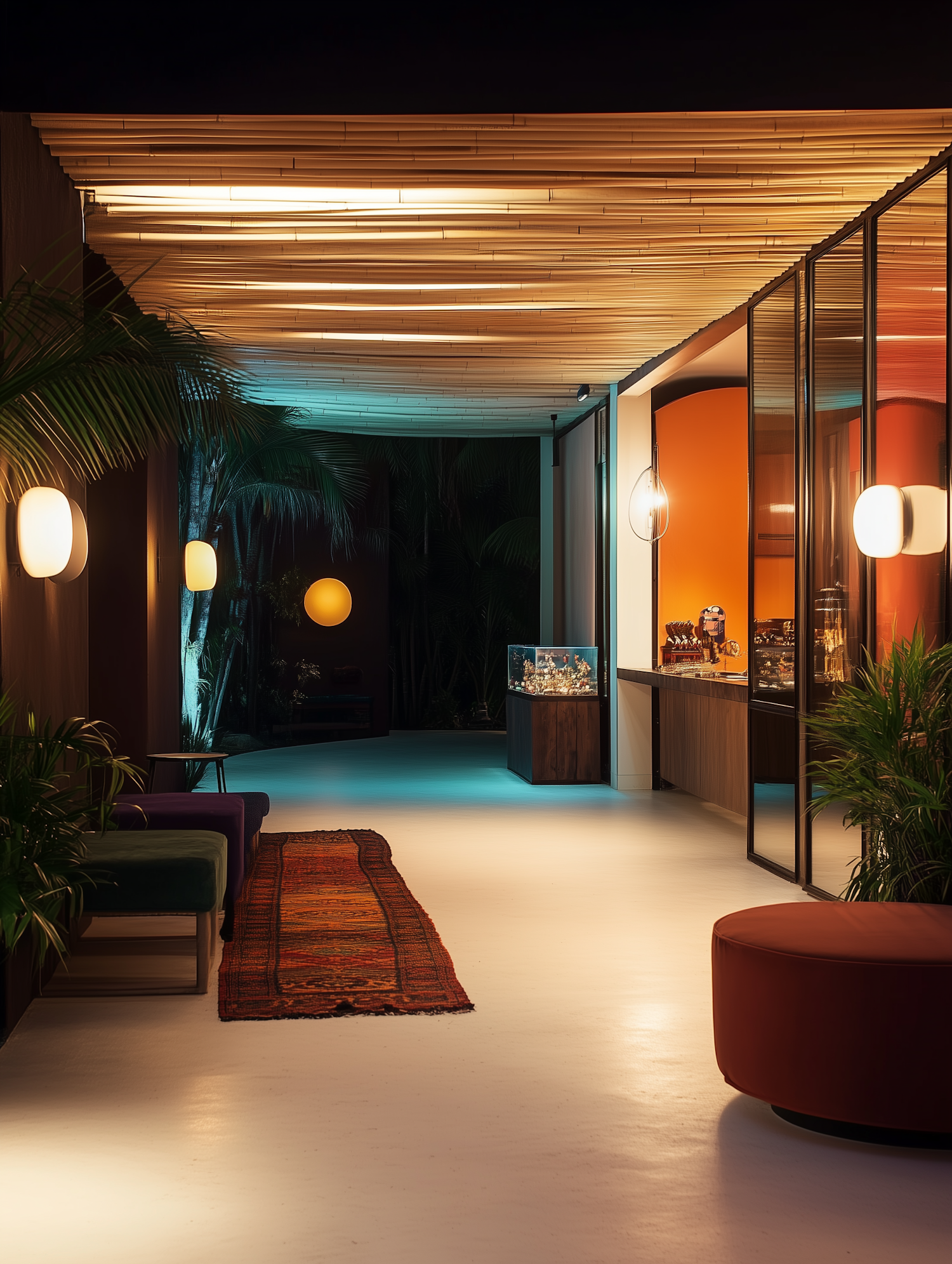 Modern hallway with wooden ceiling, warm lighting, patterned rug, glass display, and lush plants for a serene ambiance.