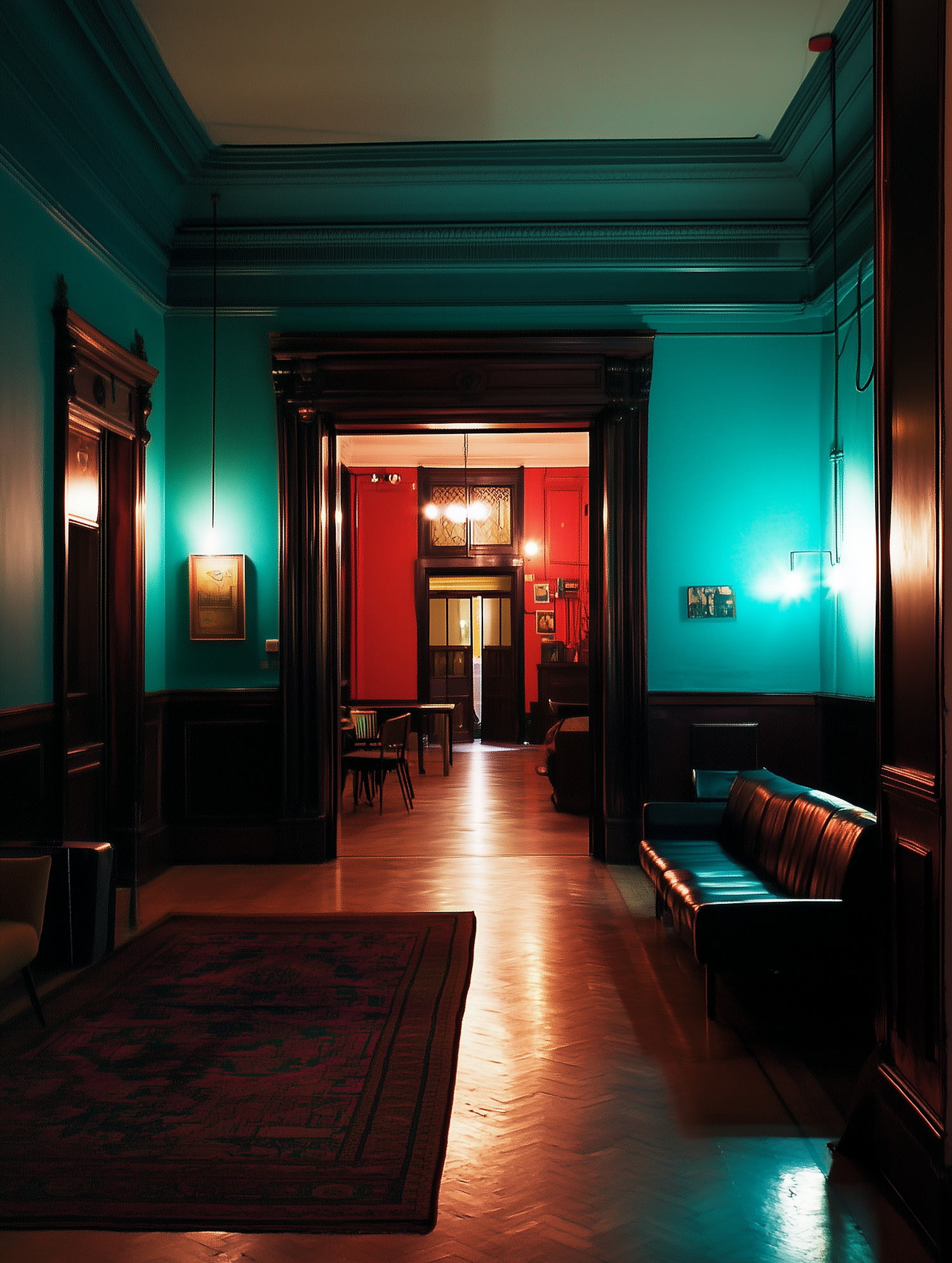 Elegant interior with teal and red walls, leather seating, wooden floors, and warm lighting creating a cozy, vintage-inspired atmosphere.