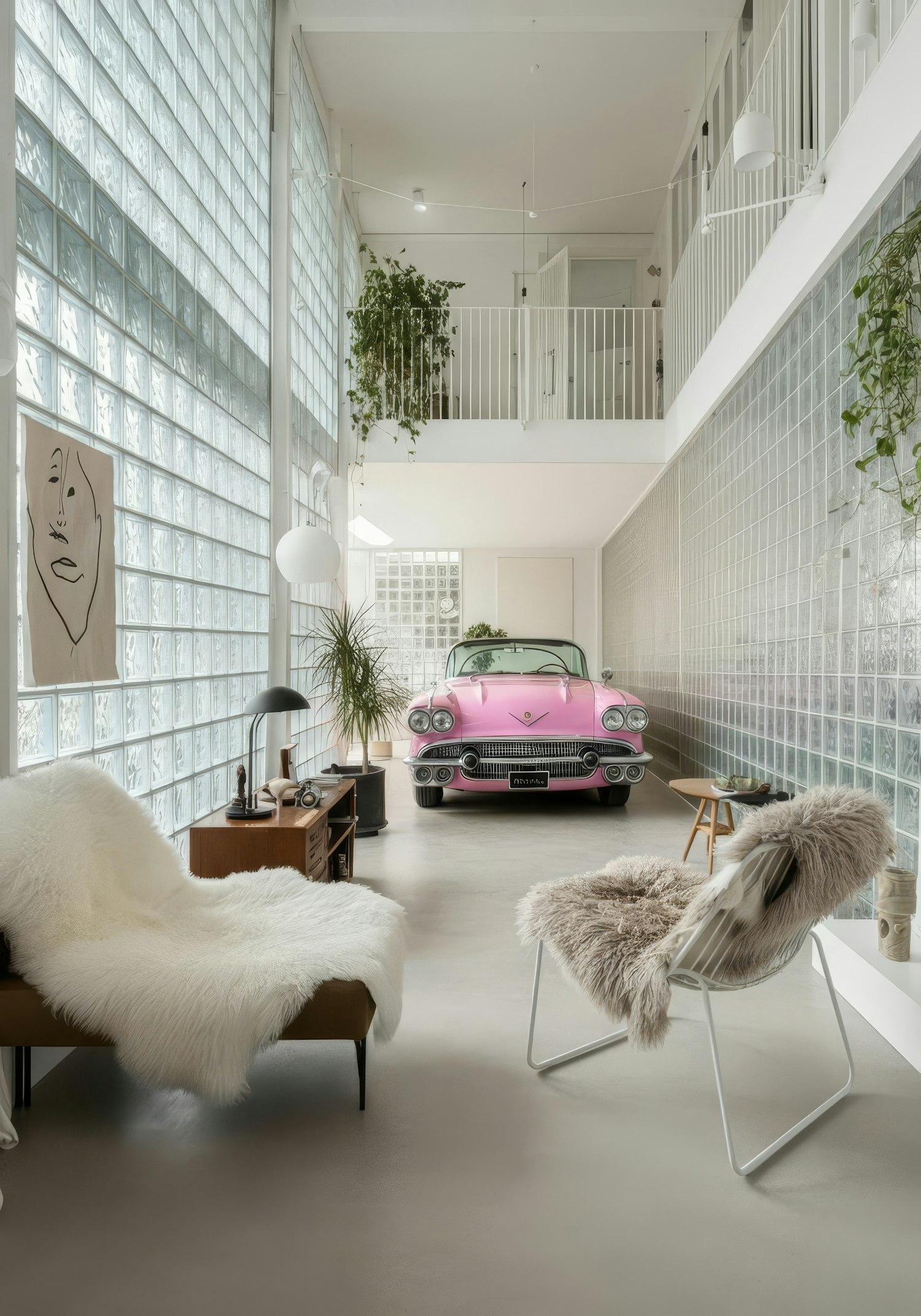 Bright modern interior with a vintage pink car, glass block walls, and cozy furniture, blending automotive and residential design.