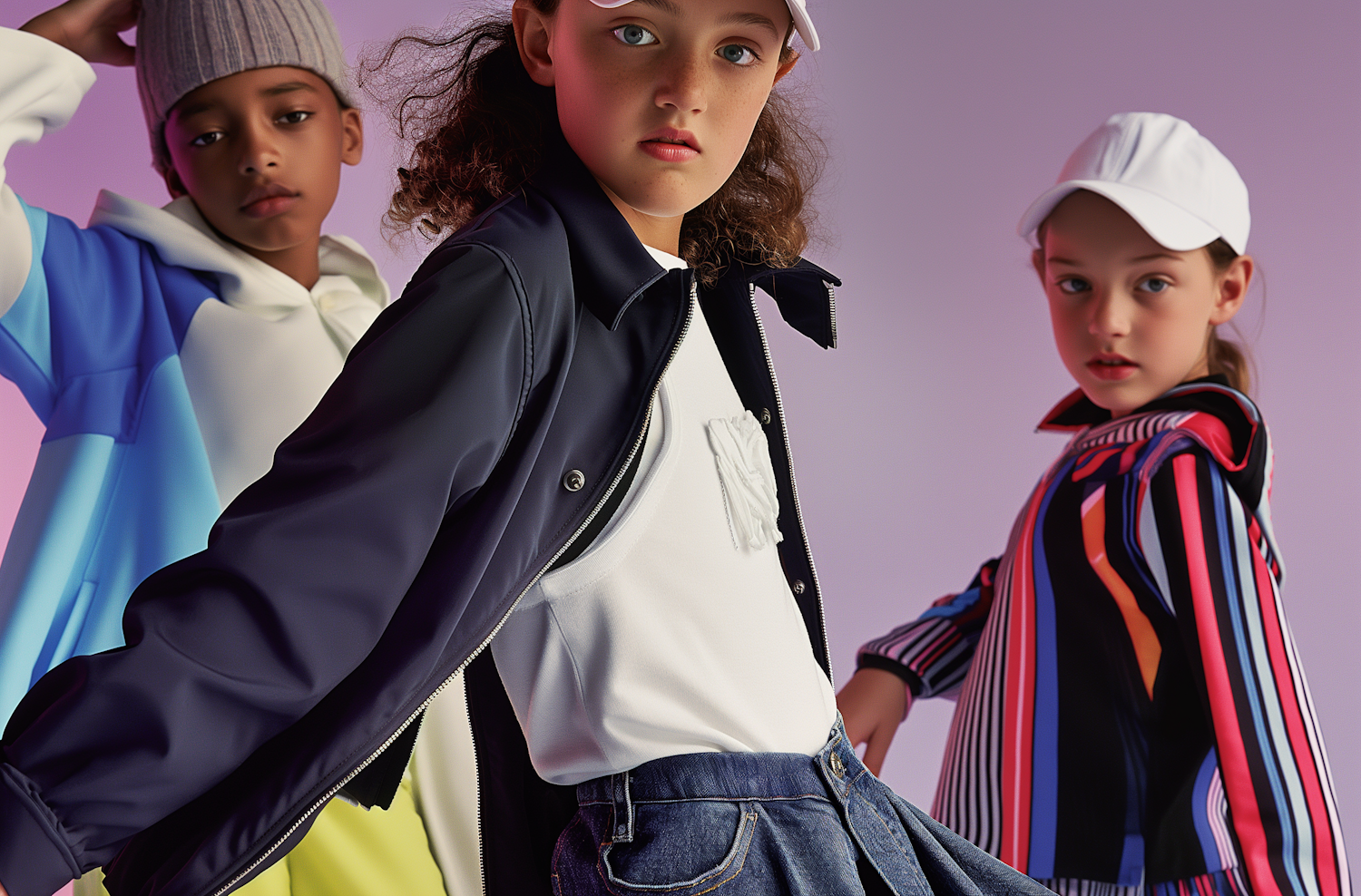 Three stylish kids in colorful outfits pose confidently against a purple gradient background, showcasing trendy fashion and bold expressions.