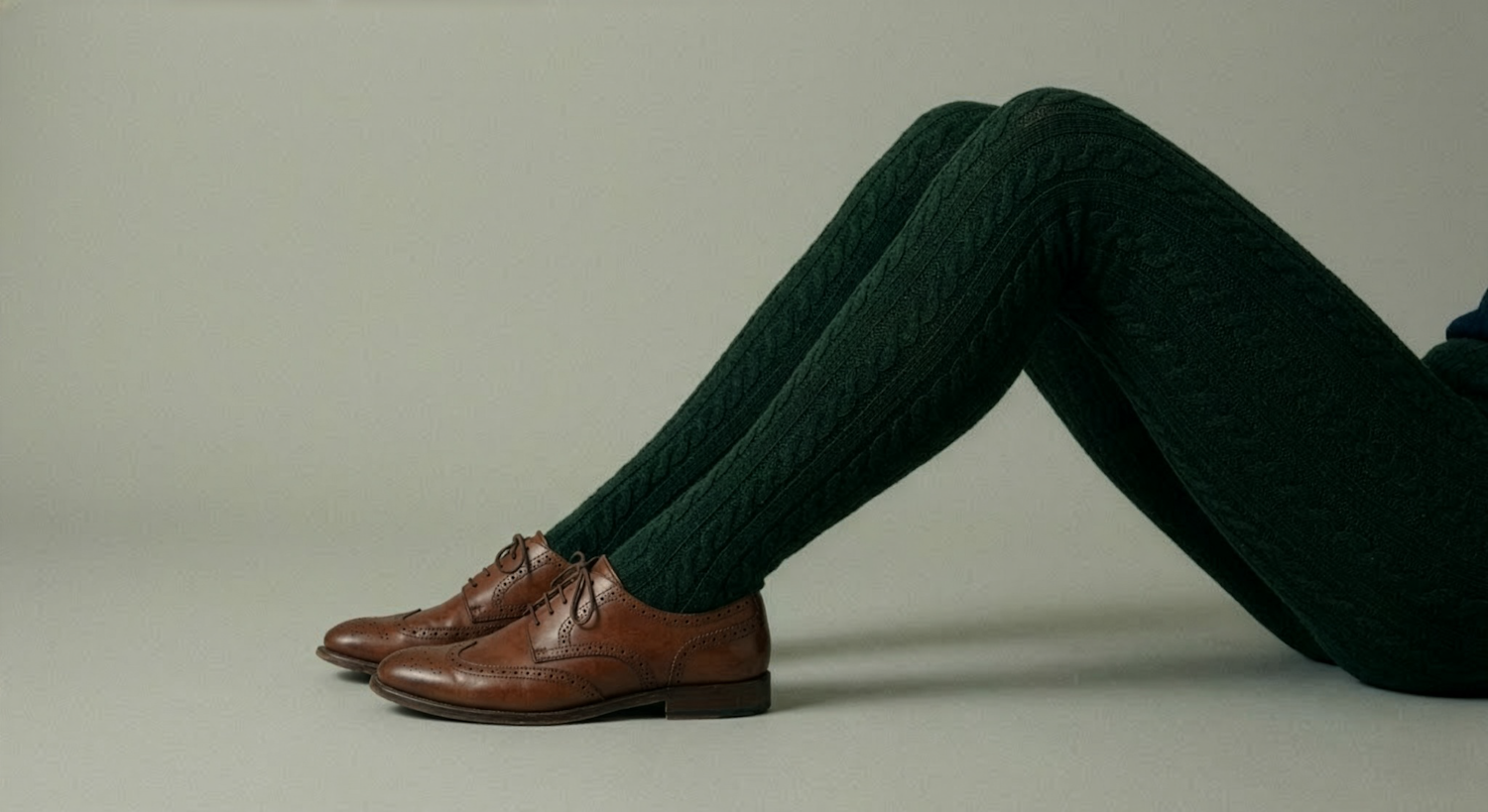 Close-up of legs in green knit tights and brown leather brogues, seated against a neutral background, showcasing texture and style.