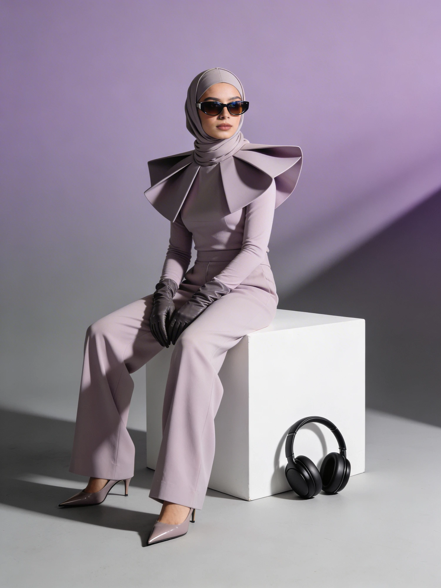 A high‑definition, minimalist editorial portrait. A stylish person sits on a white cube beside a pair of oversized matte‑black over‑ear headphones leaning against the floor. They wear a soft monochrome outfit: long‑sleeved top, wide‑leg trousers, and a sculptural hijab styled with modern folds. Accessories include tinted sunglasses, fitted gloves, and pointed heels. The background fades from lavender to grey with sharp directional shadows. No logos, no watermarks, no extra text.
