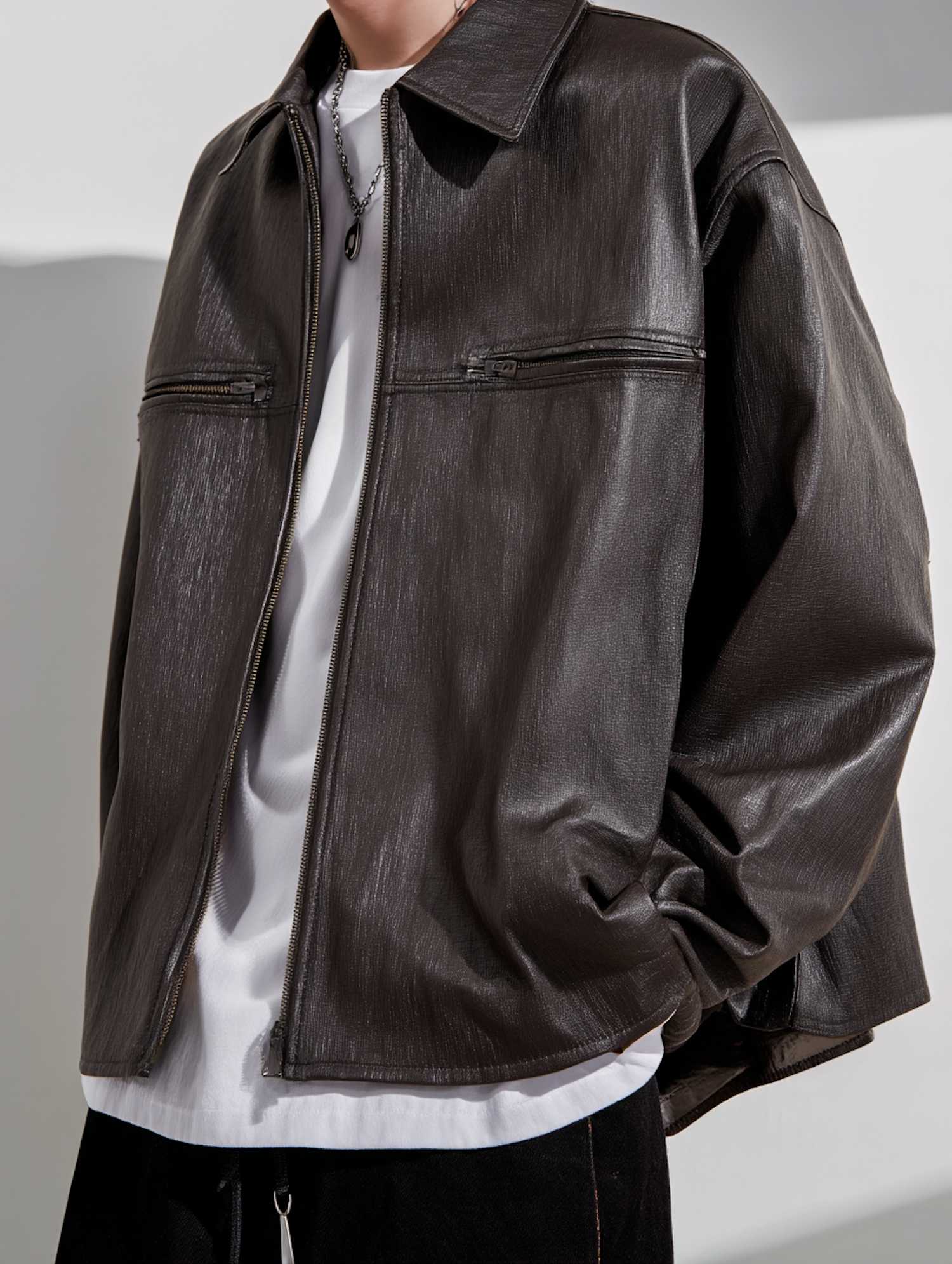 Stylish dark brown leather jacket with zippered pockets, paired with a white t-shirt and silver chain necklace for a sleek, casual look.