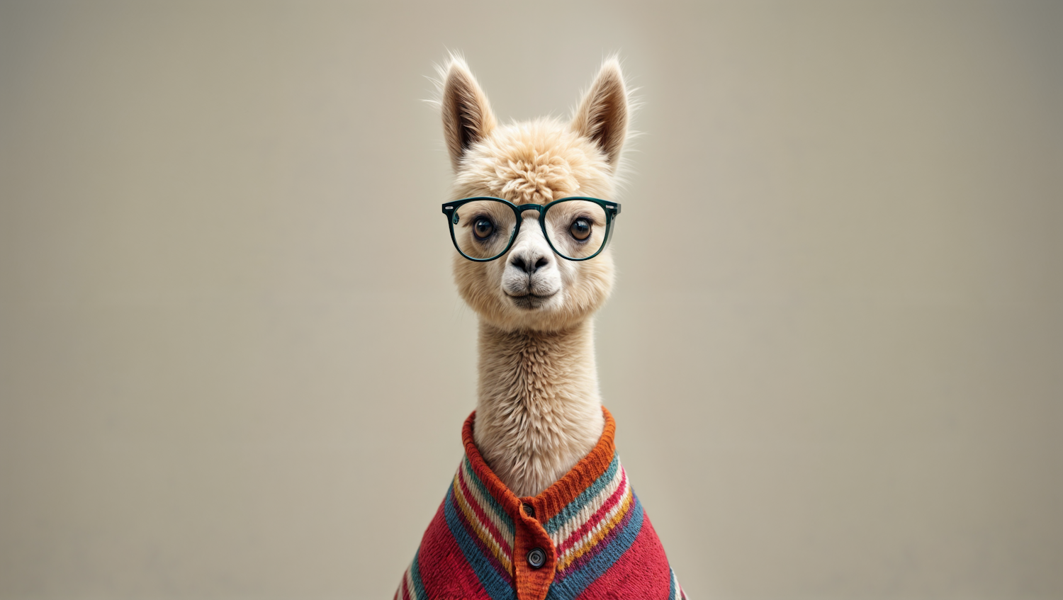 A stylish llama wearing glasses and a colorful striped sweater, set against a neutral beige background for a quirky, fun vibe.