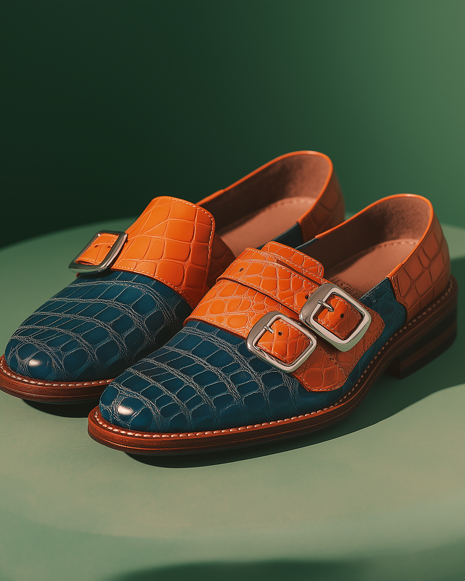 Elegant loafers with blue and orange crocodile-patterned leather and silver buckles, set against a green background.