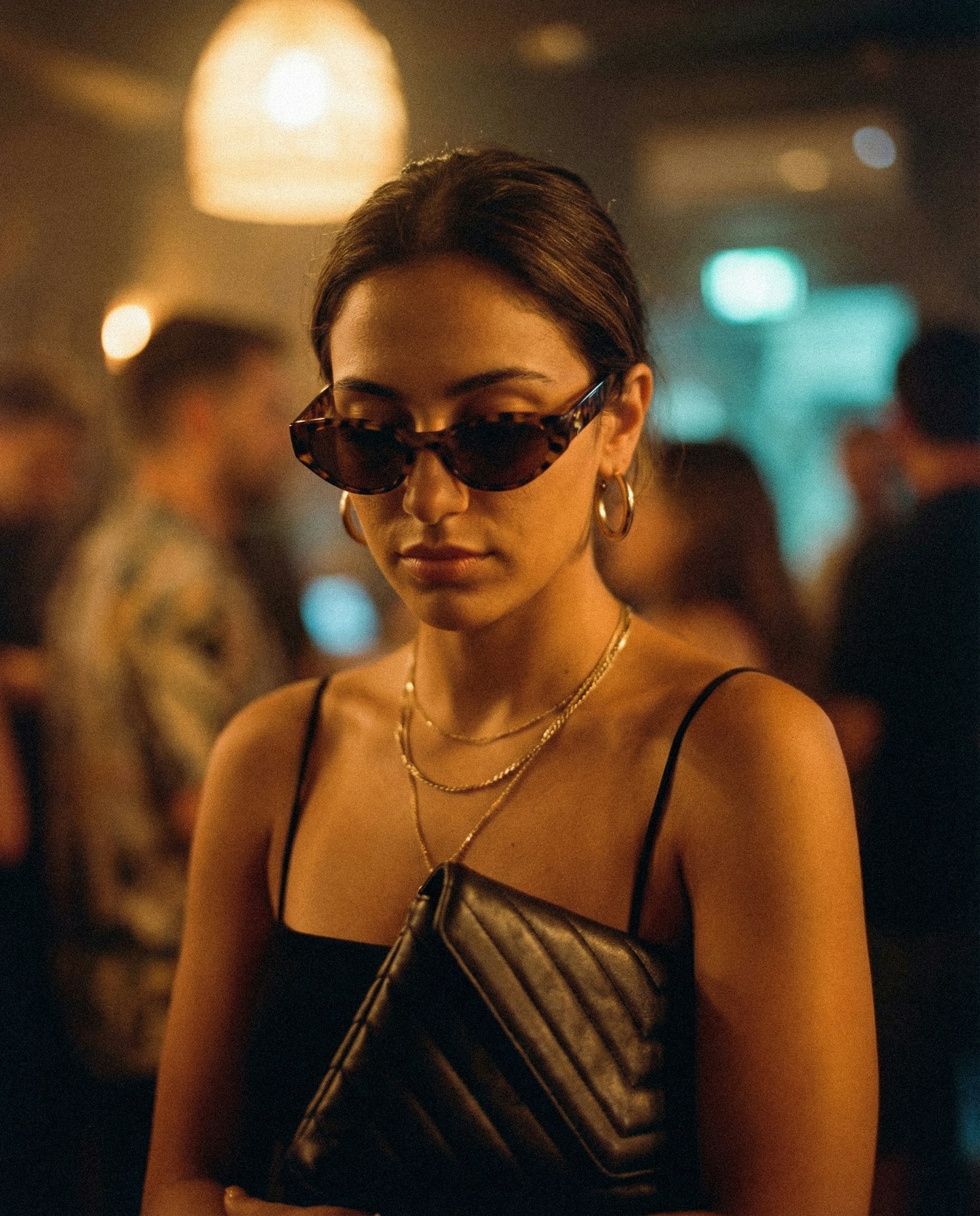 Stylish woman in sunglasses and black outfit holding a clutch in a warmly lit social setting.