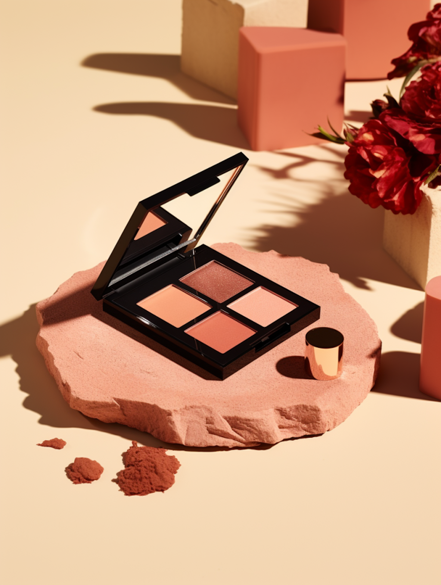 Elegant makeup palette with warm tones on a stone slab, surrounded by geometric blocks and red flowers, creating a modern aesthetic.