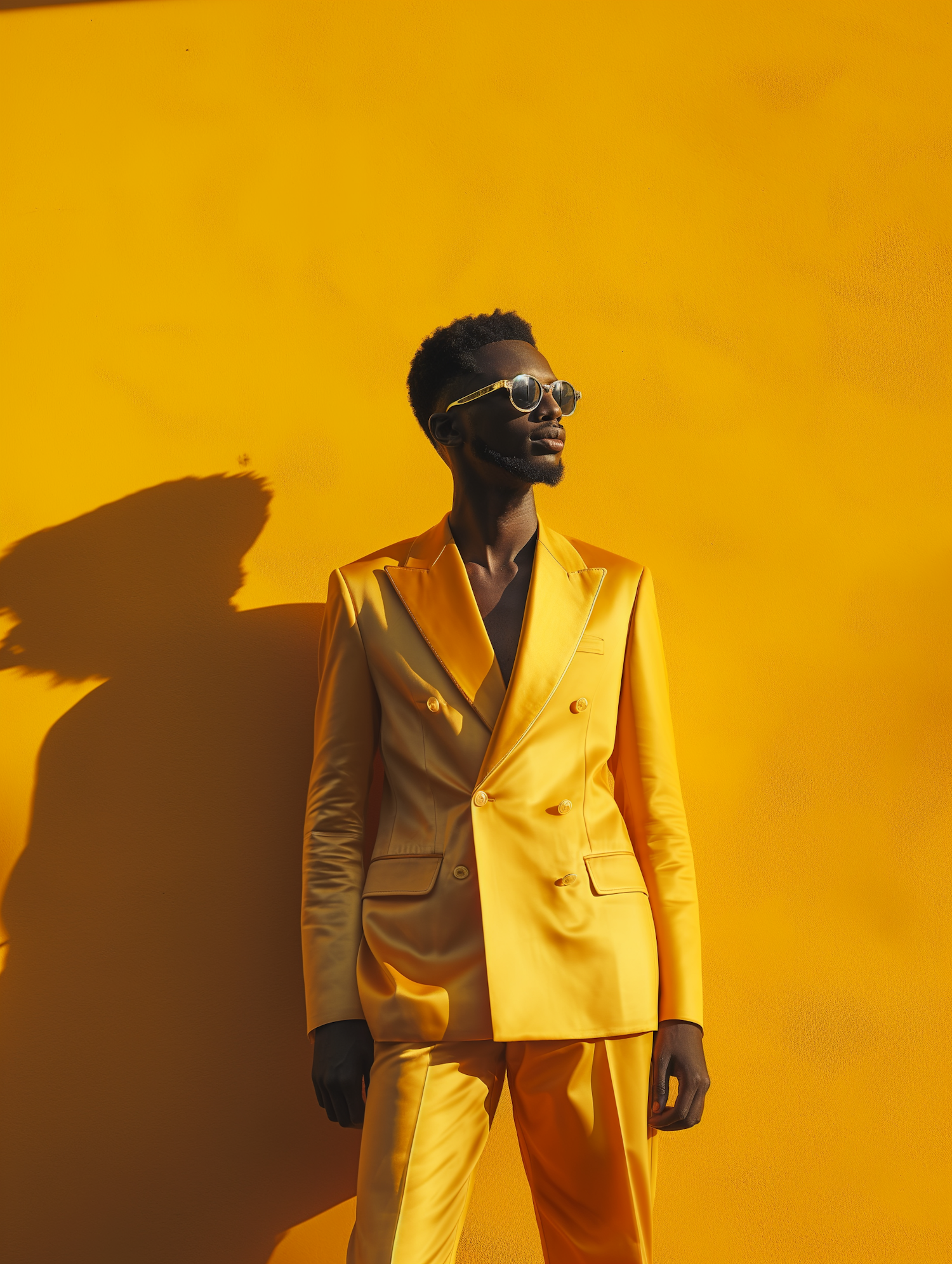 Stylish man in a yellow suit and sunglasses against a vibrant yellow background, casting a striking shadow.