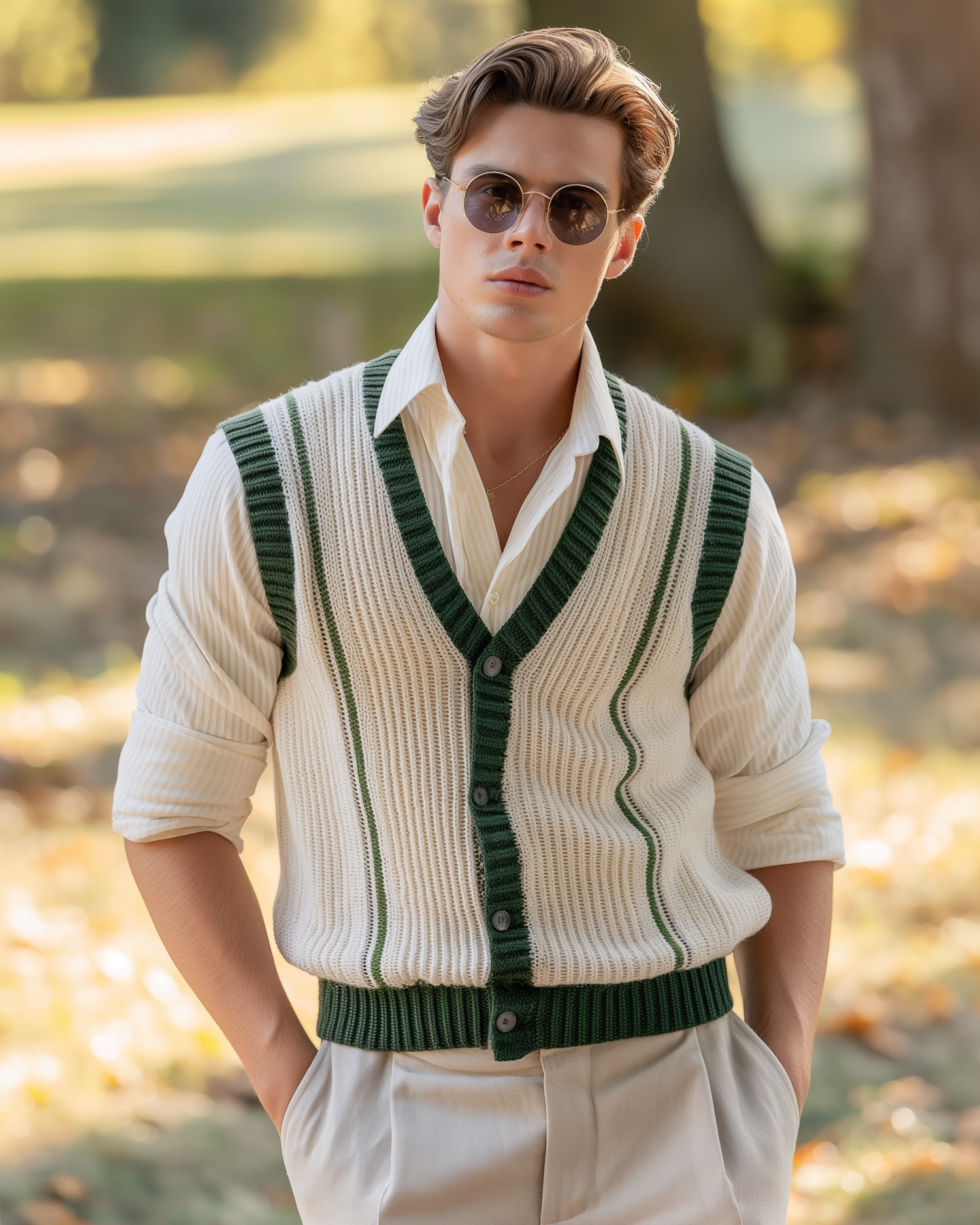 Stylish young man in sunglasses and a striped vest, standing outdoors with a relaxed pose in a sunlit natural setting.
