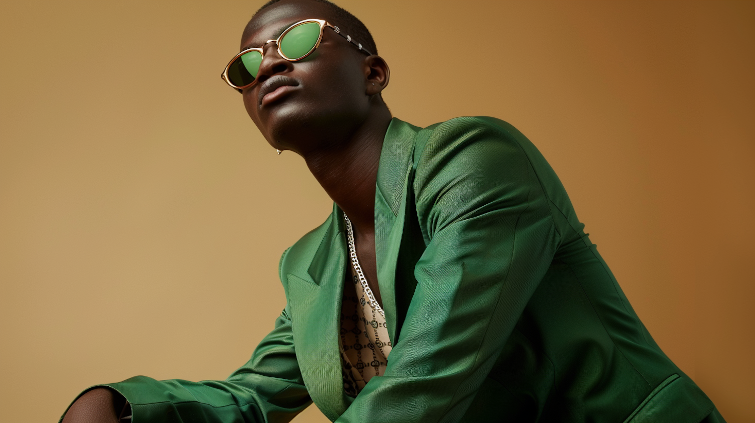 Stylish man in green suit and sunglasses, exuding confidence against a warm brown background.