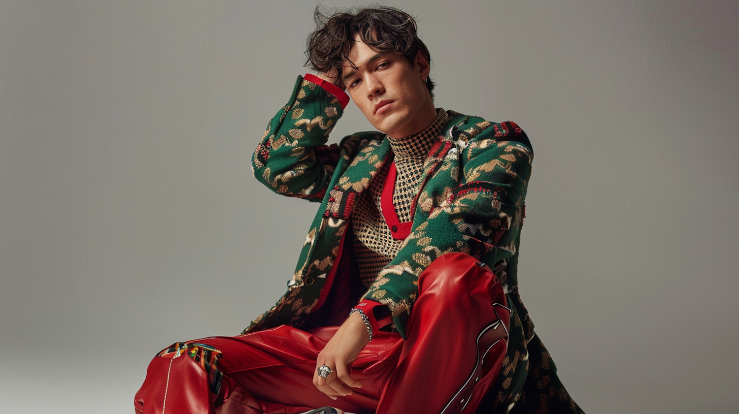Young man in colorful patterned jacket and red leather pants, sitting in a relaxed pose against a neutral background.