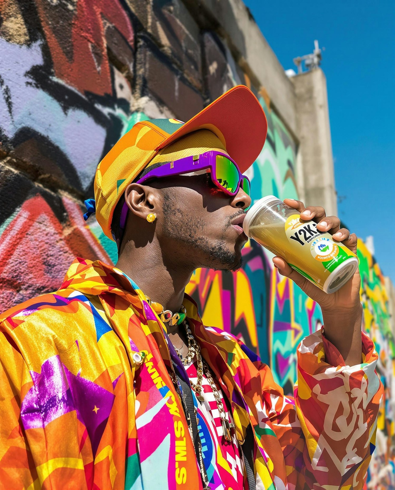 A stylish man in a colorful outfit sips a drink labeled 'Y2K' against a graffiti wall under a clear blue sky. Bold and vibrant street style.