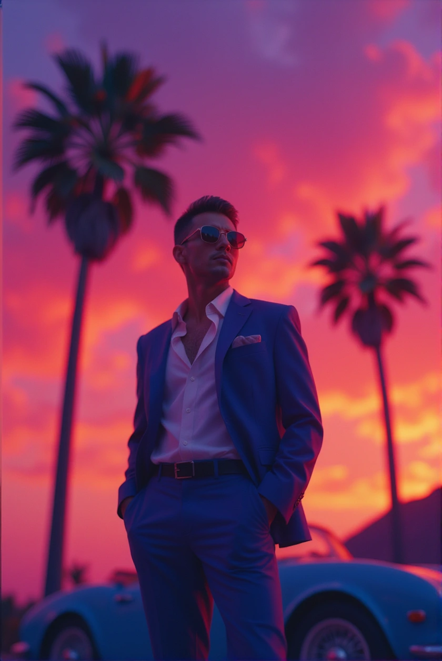 Stylish man in blue suit with sunglasses against a vibrant sunset, palm trees, and classic car, exuding retro sophistication.