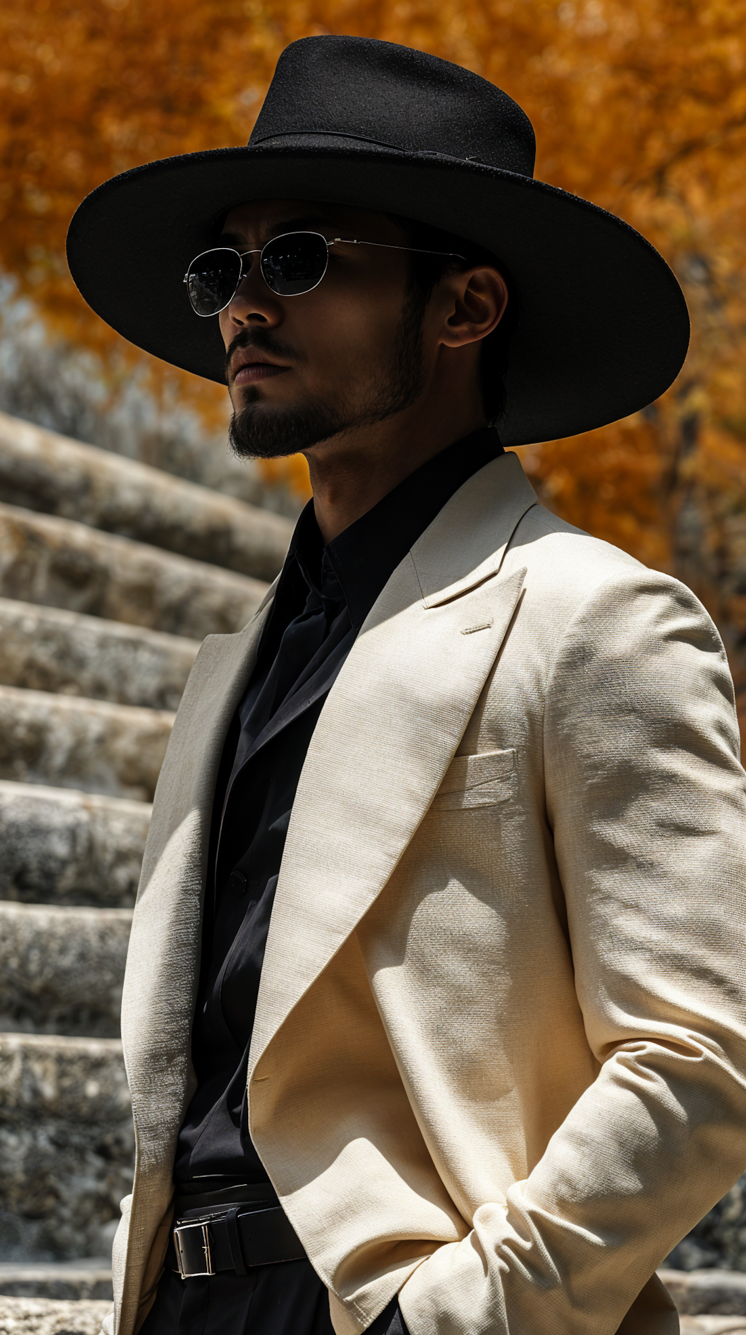 Stylish man in beige suit and black hat, exuding elegance and mystery against an autumn backdrop.