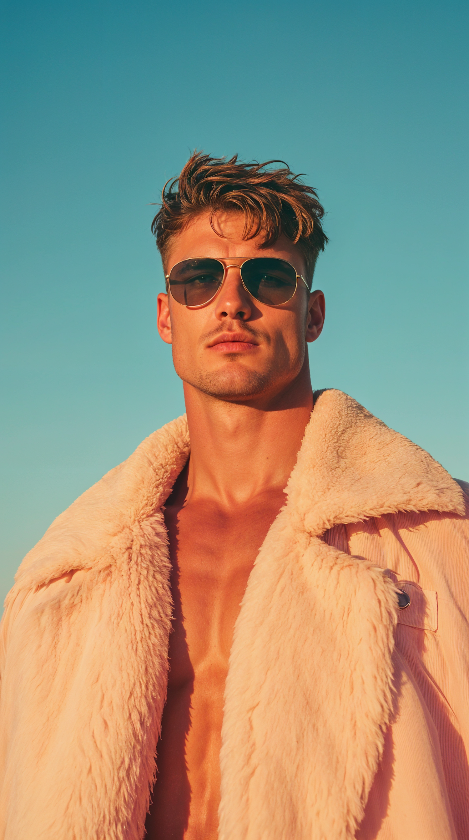 Stylish man in aviator sunglasses and fur coat against a blue sky, exuding confidence and elegance.