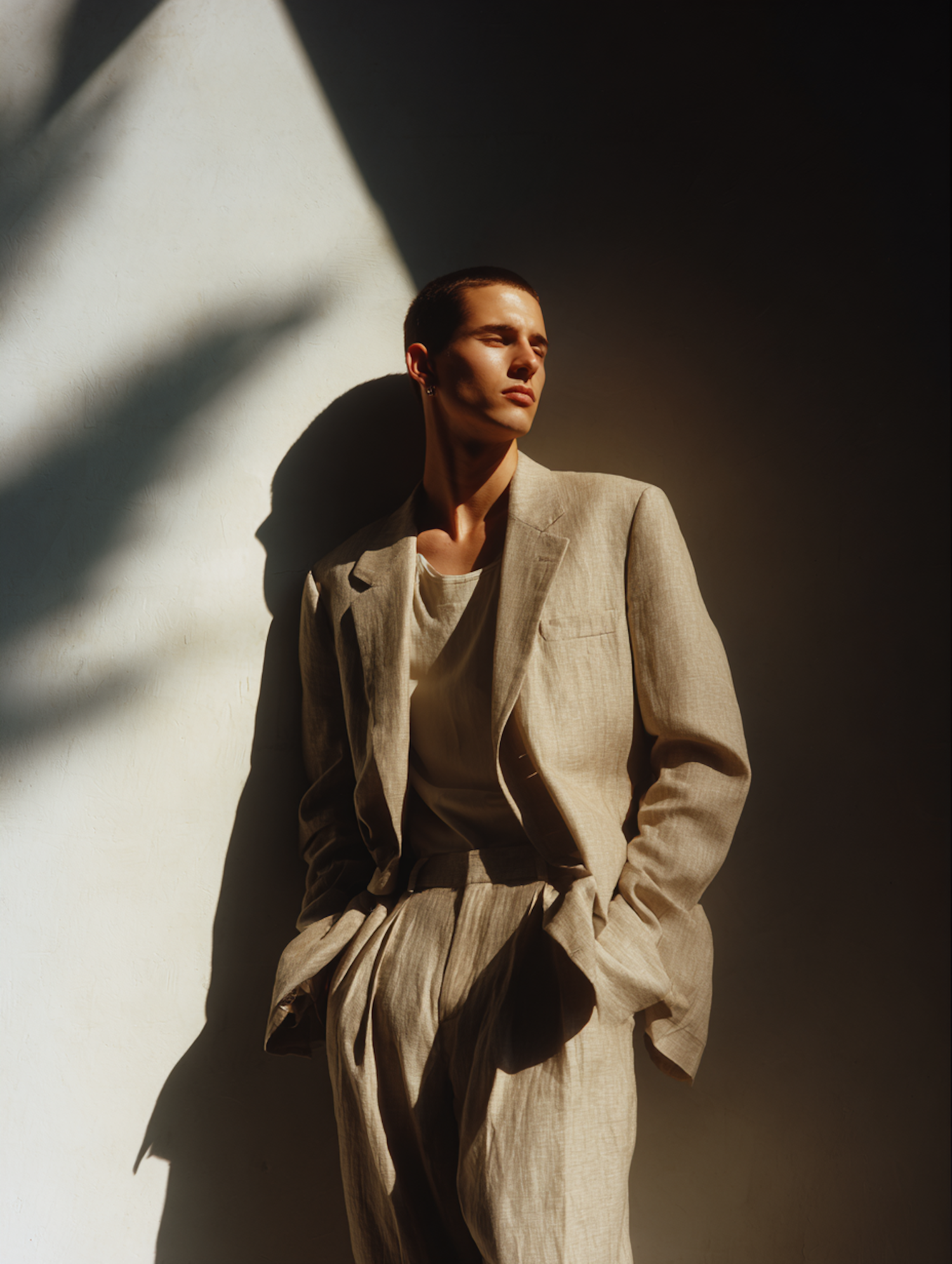 A young man in a beige suit stands against a softly lit wall, with dramatic shadows and a calm, contemplative expression.