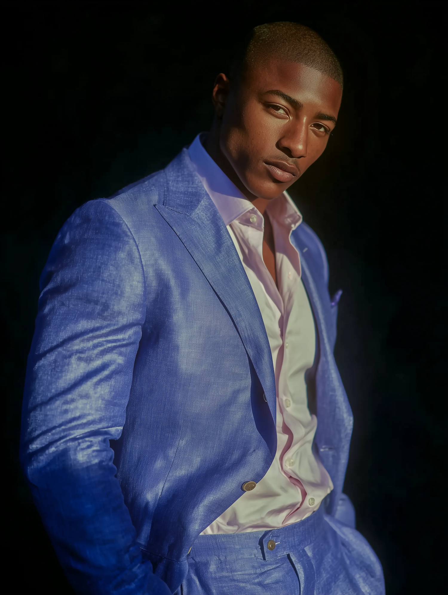 A man in a blue suit and pink shirt stands confidently against a dark background, showcasing a stylish and modern look.