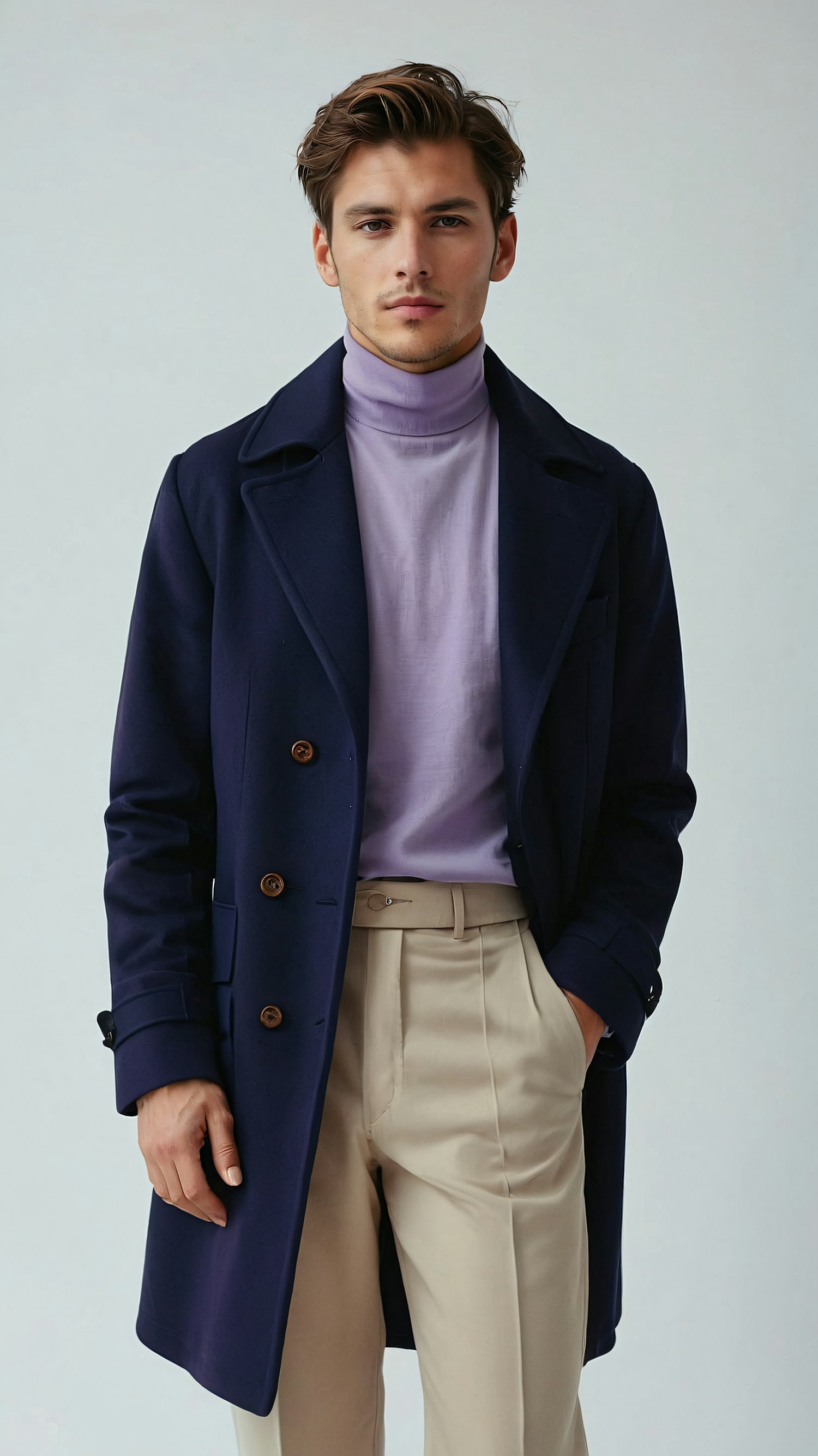 Stylish man in navy coat and lavender turtleneck, beige trousers. Face blurred, focus on elegant fashion ensemble.