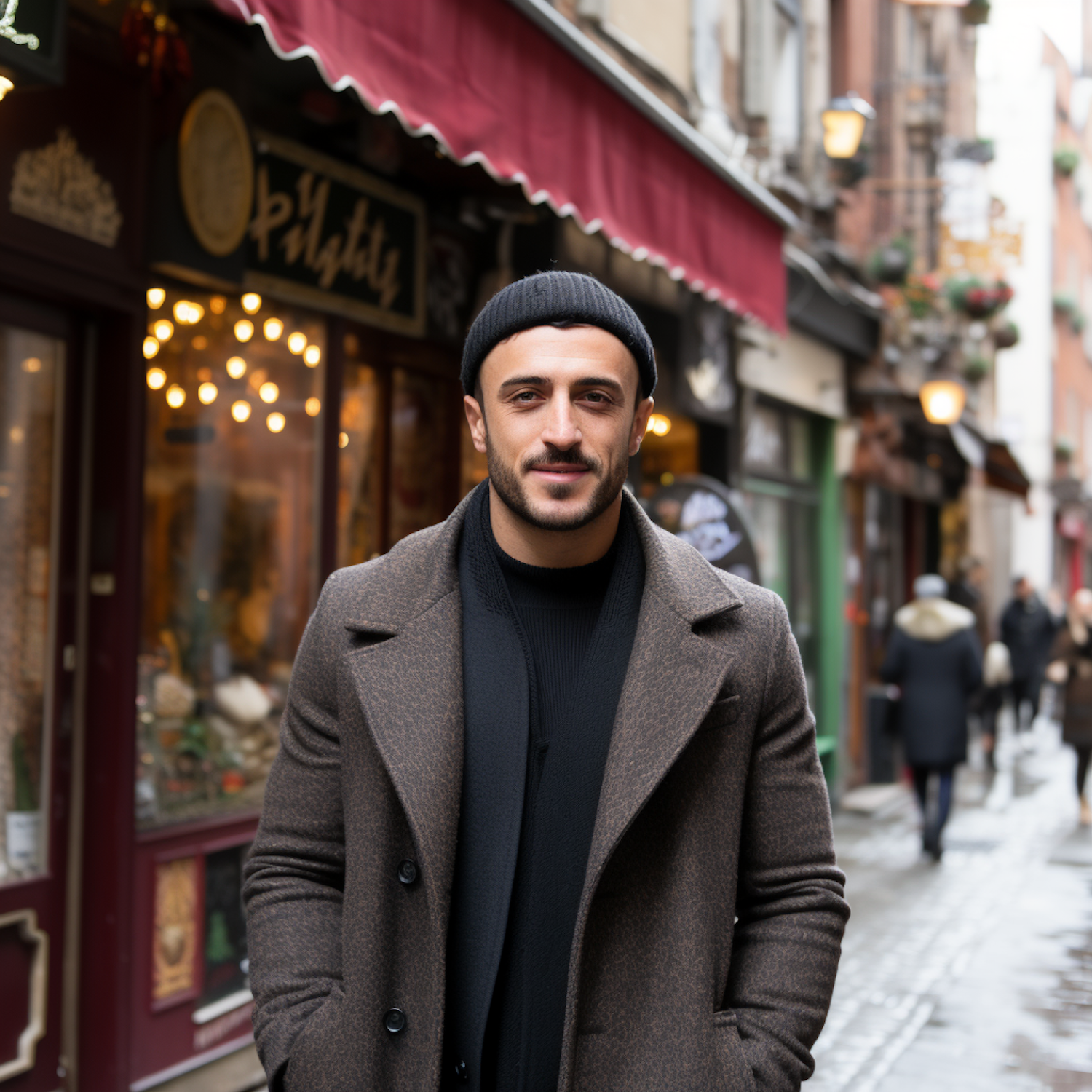 Man in a stylish coat and beanie stands in a charming, bustling street with shops and warm lights, exuding a cozy urban vibe.