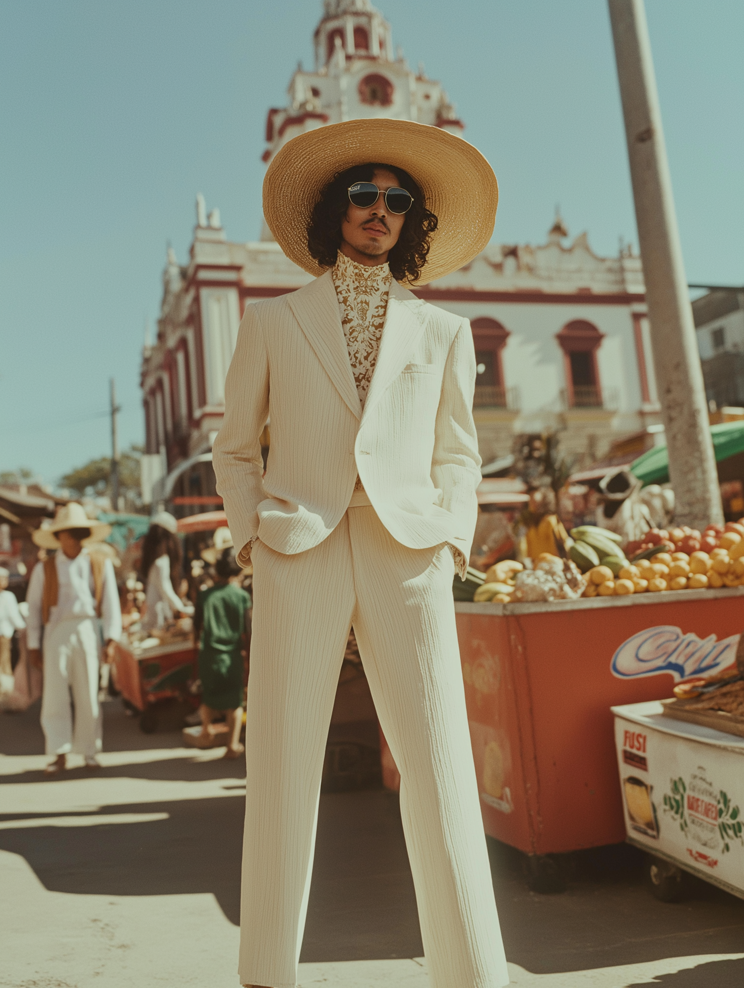 Man in a cream suit, straw hat, and sunglasses in a vibrant market with fruit stands and a grand church in the background.