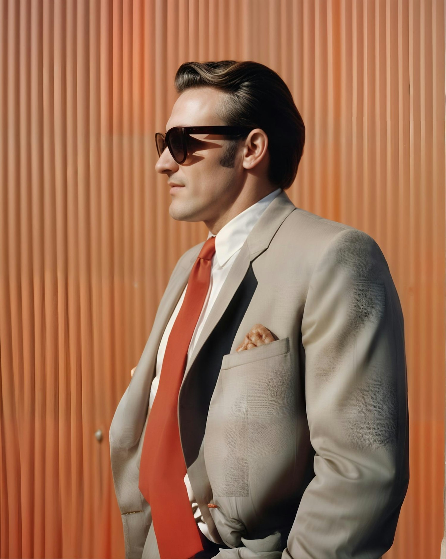 Stylish man in a gray suit with red tie and sunglasses against an orange background, exuding retro elegance and confidence.