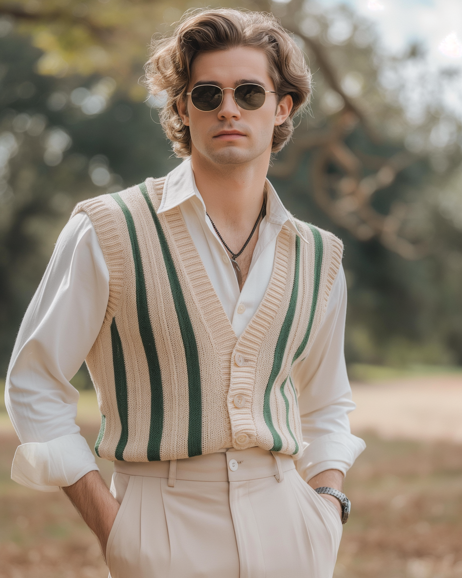 Stylish man in sunglasses and striped vest poses outdoors, exuding a vintage vibe with rolled-up sleeves and beige trousers.