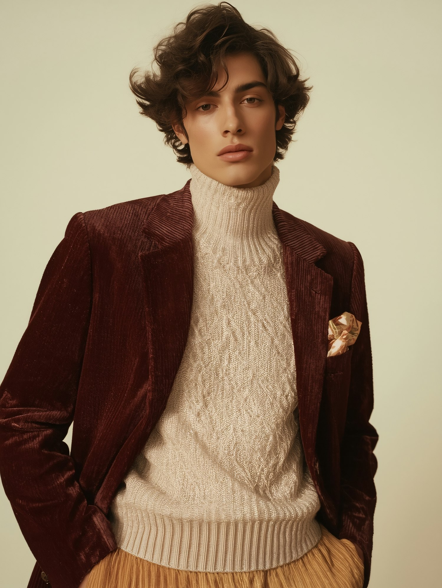 Stylish young man in a burgundy velvet blazer and cream turtleneck sweater, posing against a soft beige background.