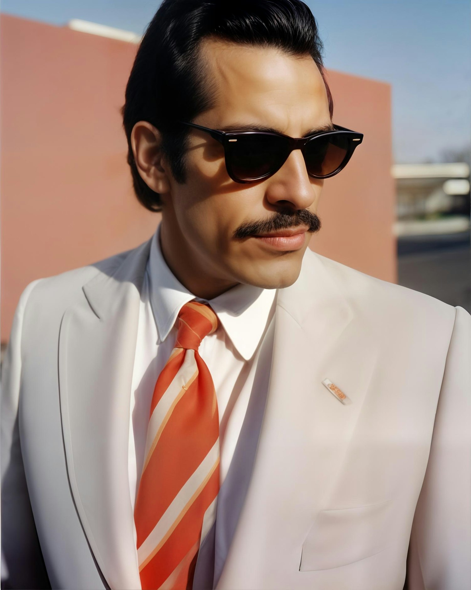 Man in white suit with orange tie and sunglasses, exuding retro elegance against a sunny outdoor backdrop.