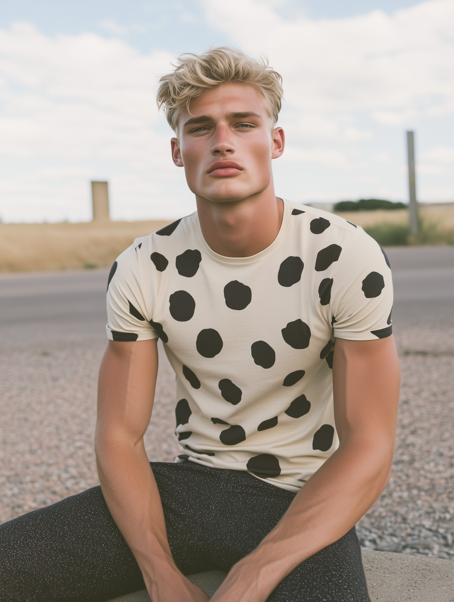 Blonde man in a polka-dot T-shirt sits outdoors with a serious expression, blending casual style with a rural backdrop.