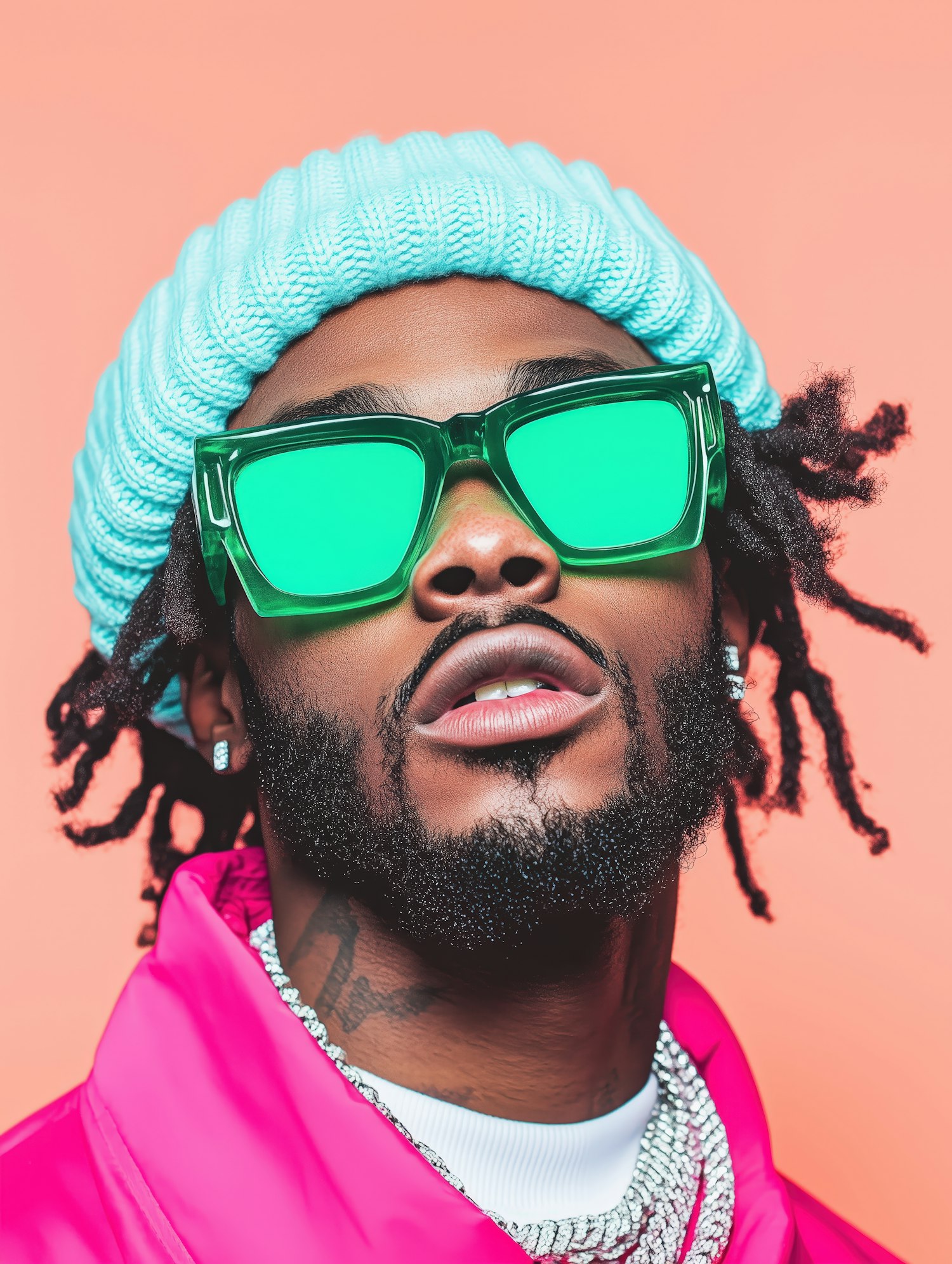 Stylish man in green sunglasses, pink jacket, and blue beanie against a peach background. Bold fashion and vibrant colors stand out.