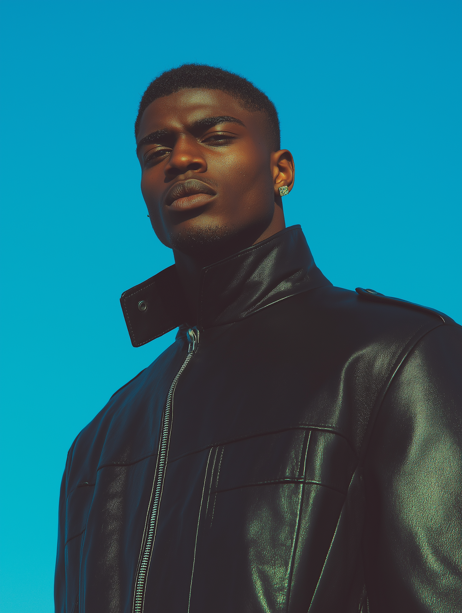 Stylish portrait of a young man in a black leather jacket against a vibrant blue sky, exuding confidence and modern fashion vibes.
