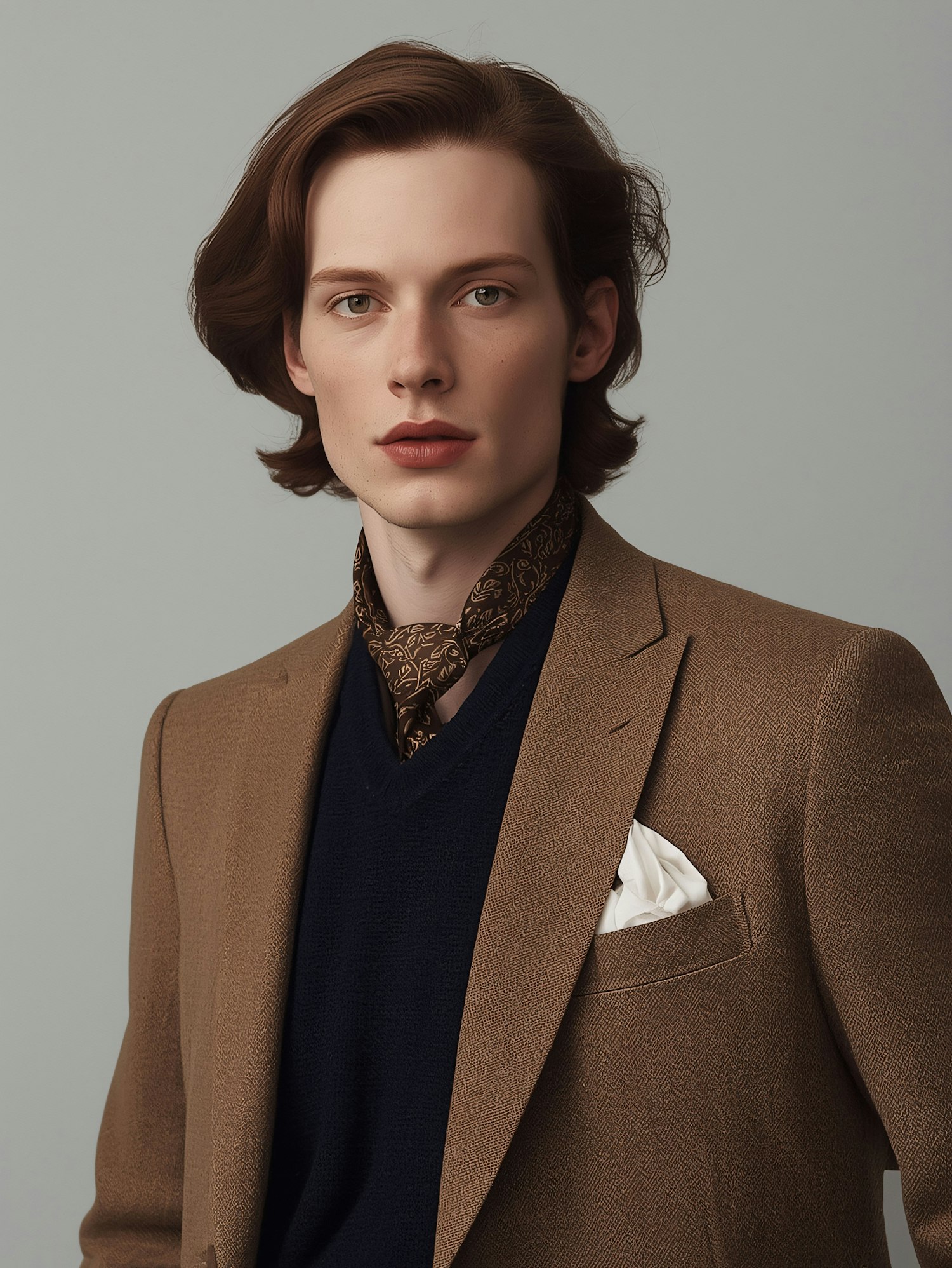 Stylish young man in a tan blazer, navy sweater, and patterned scarf, with a white pocket square, posing against a neutral background.