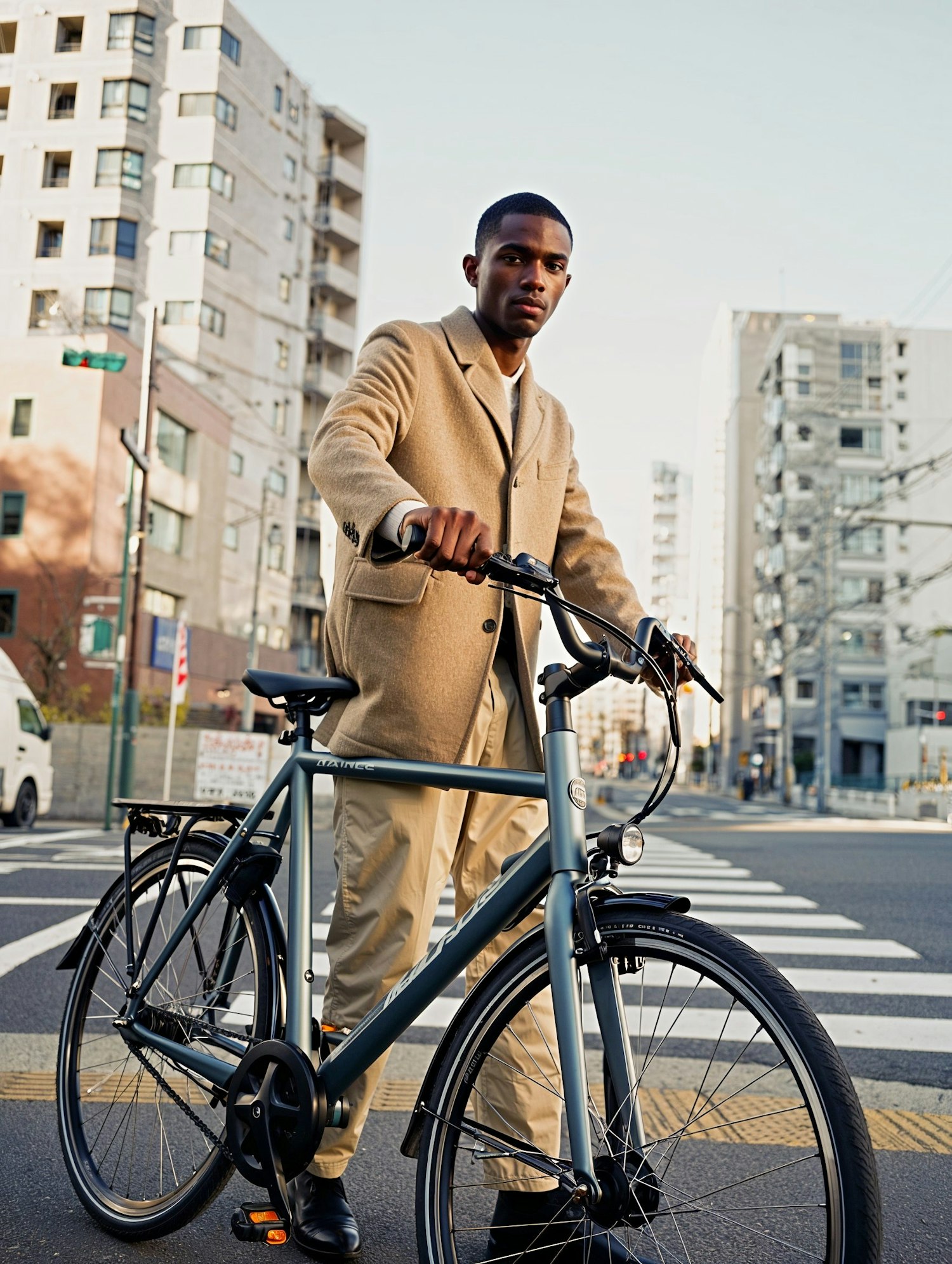 Stylish man in a beige coat with a sleek gray bike on a city street, surrounded by urban buildings and crosswalks.