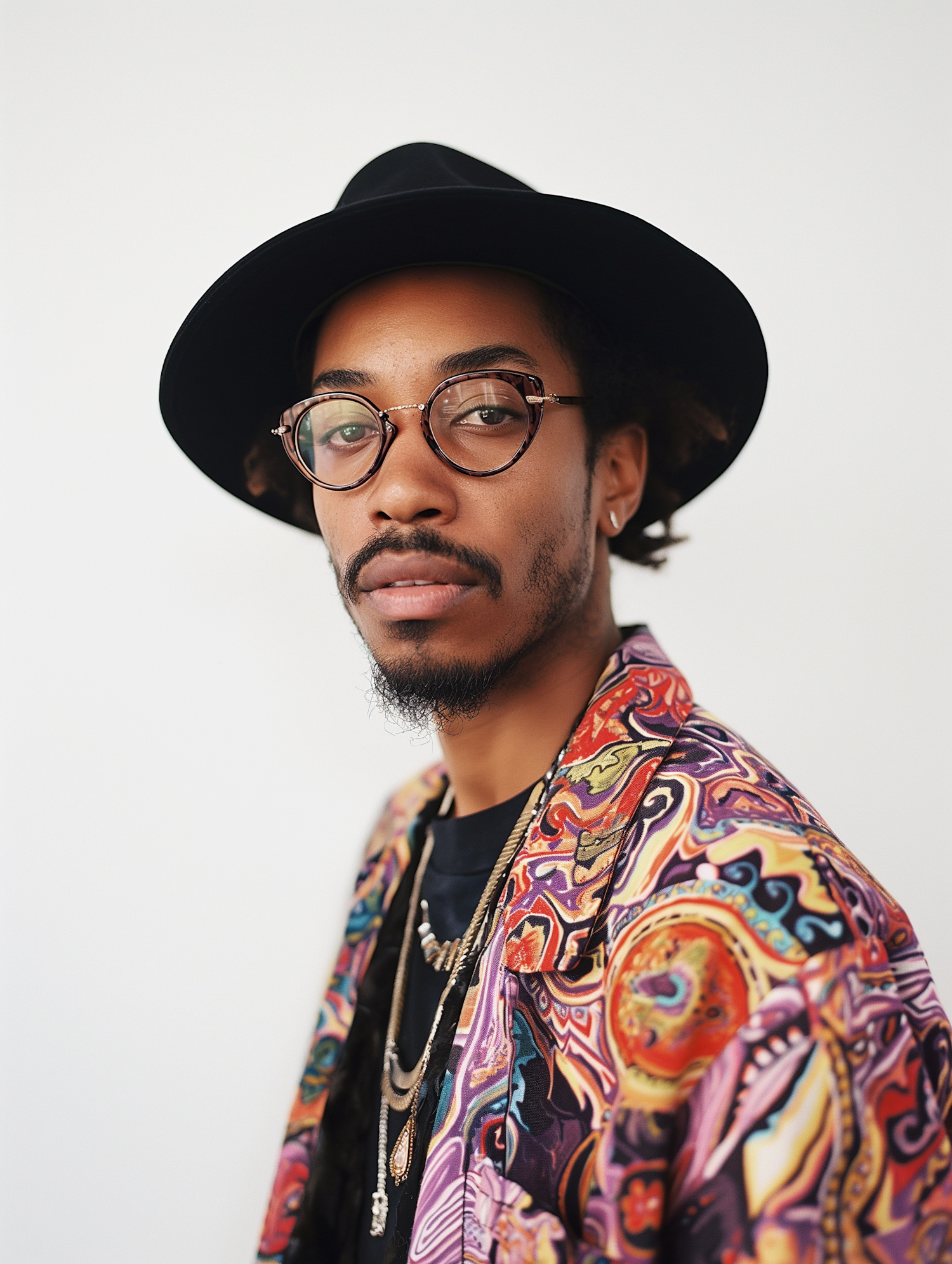 Stylish man in a colorful shirt and black hat, wearing glasses and layered necklaces, against a white background.