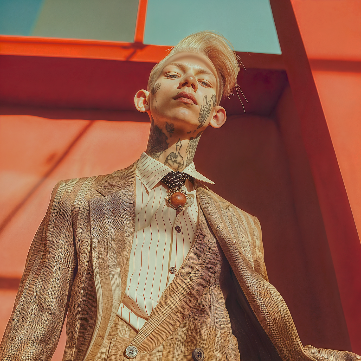 Stylish young man with facial tattoos in a plaid suit, dramatic lighting, and geometric background.
