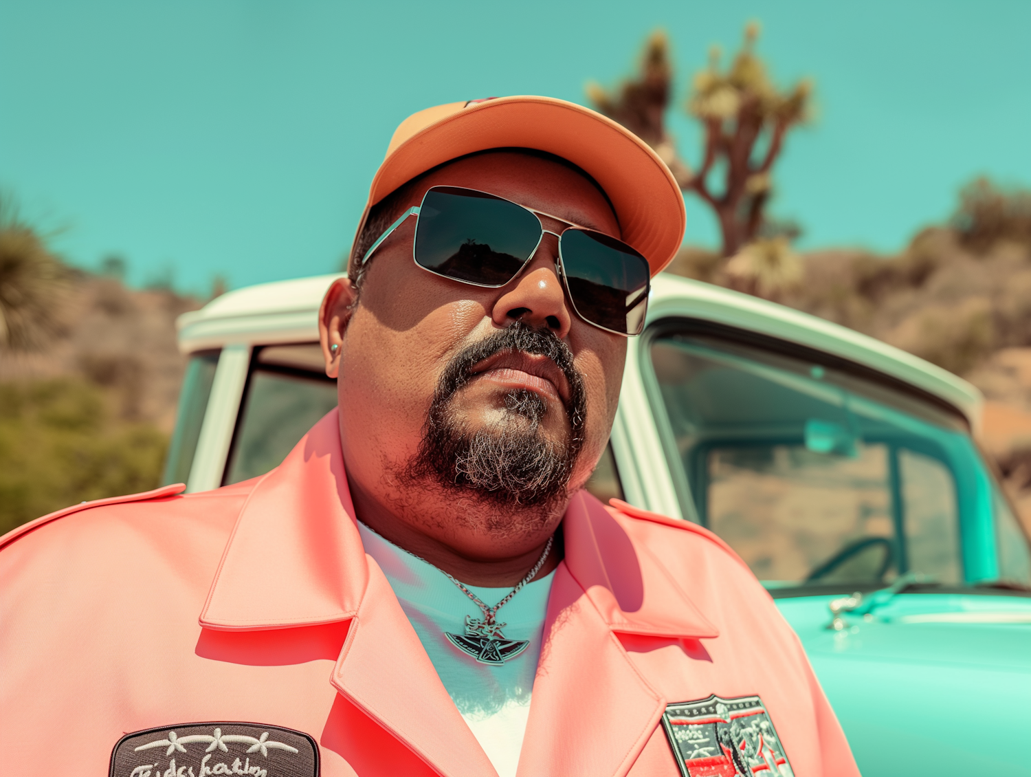 Man in pink jacket and sunglasses stands by vintage car in desert landscape, exuding confidence and style.