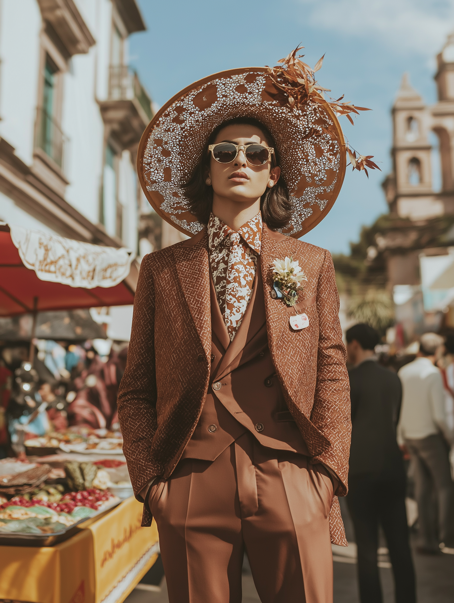 Fashion-forward individual in a brown suit and ornate hat at a vibrant outdoor market, blending elegance with cultural flair.