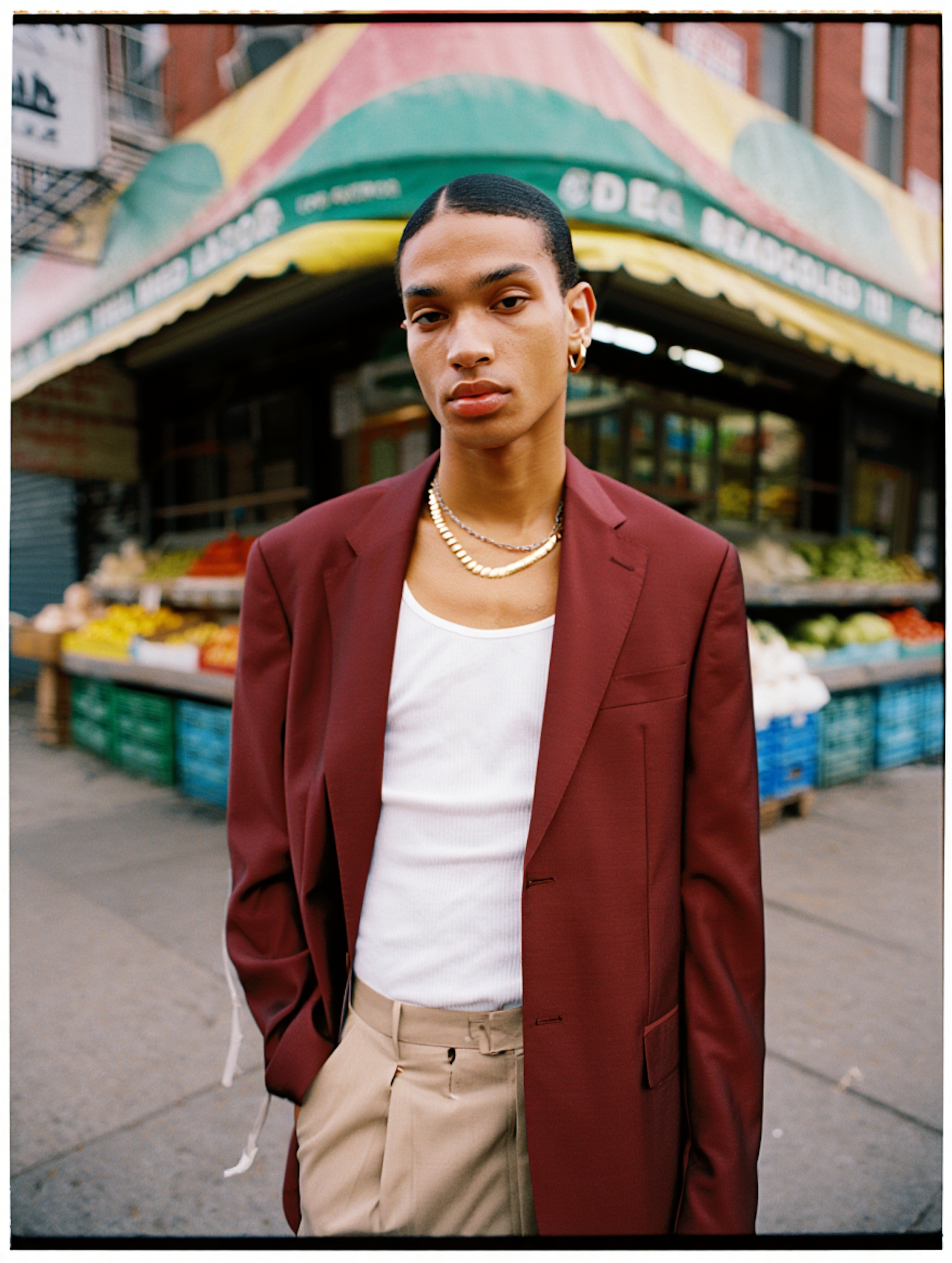 Stylish person in a maroon blazer near a market stand, accessorized with elegant gold jewelry and confidently gazing at the camera.